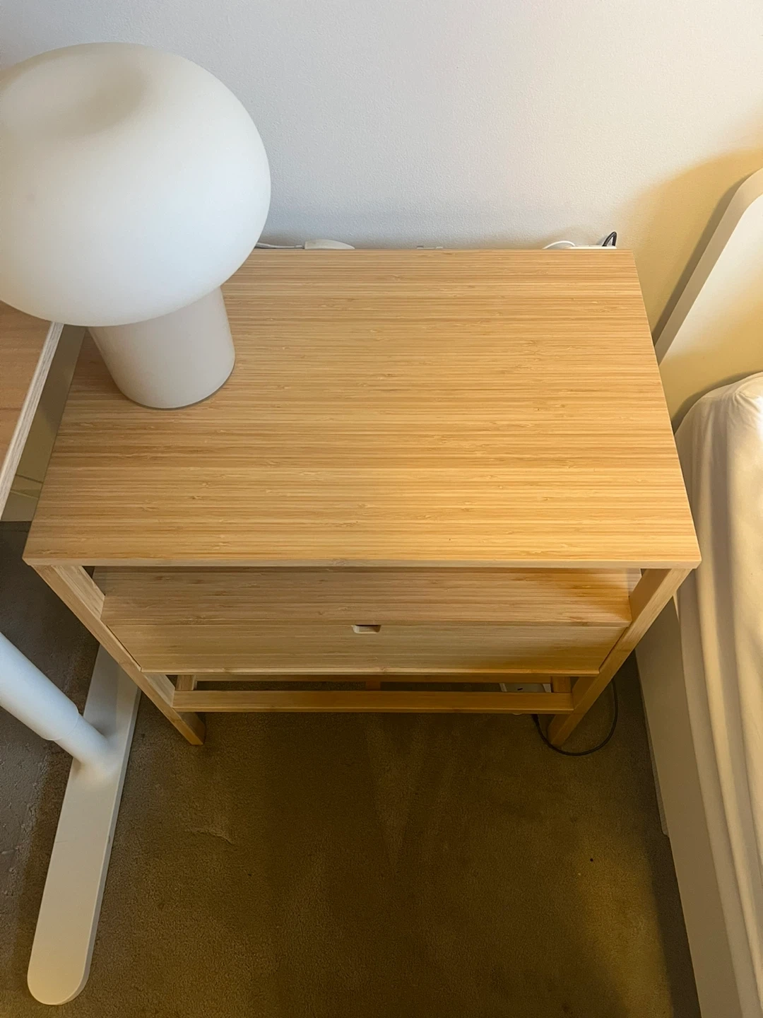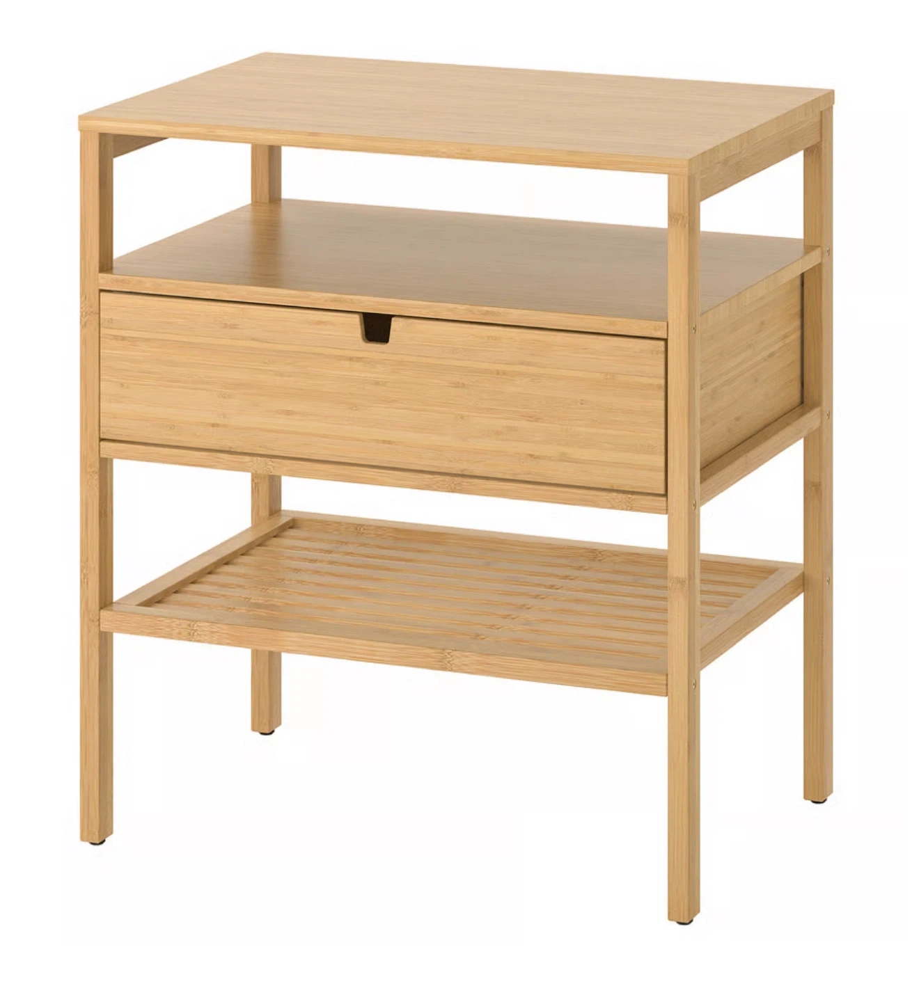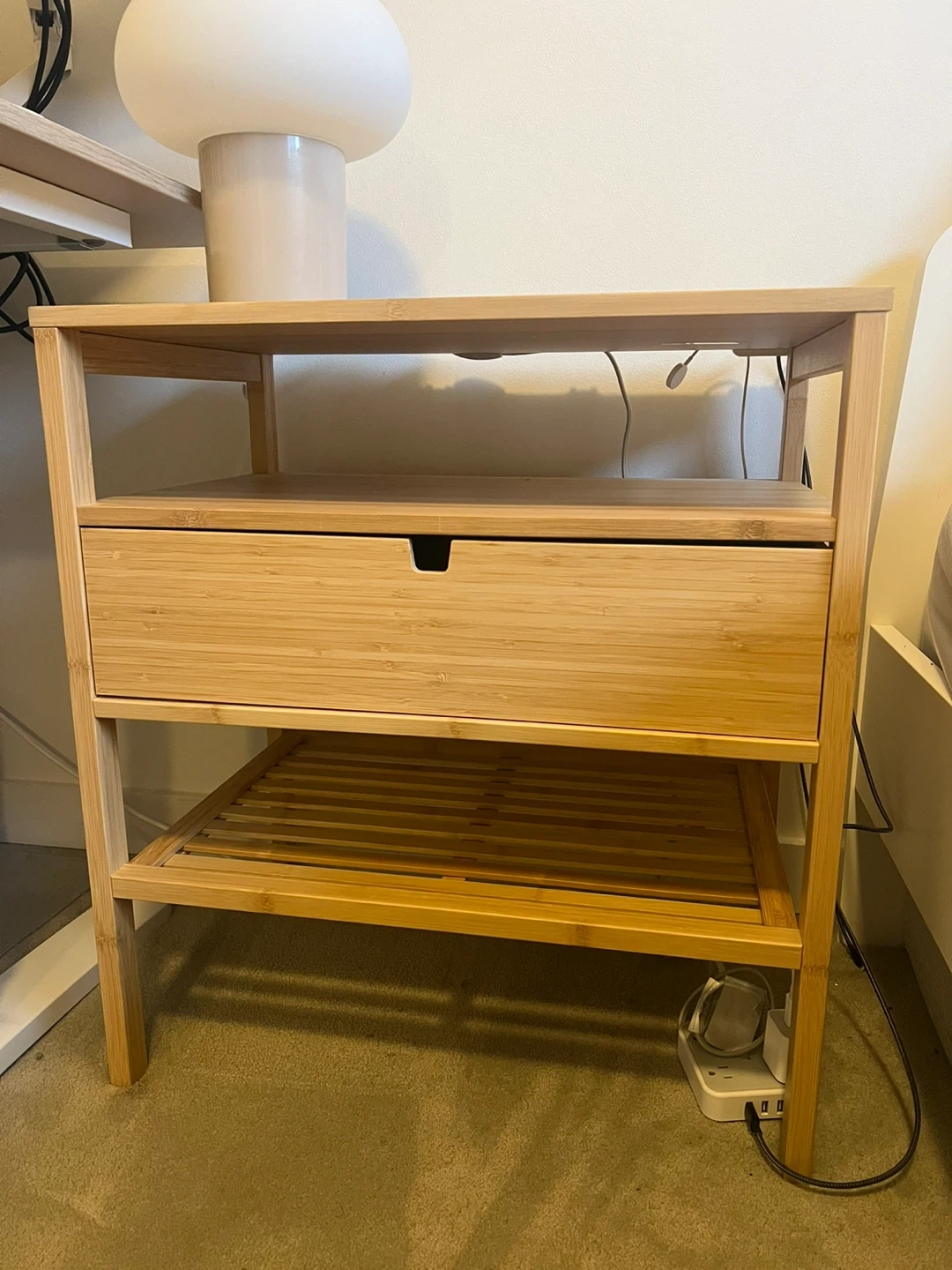 Selling a gently used IKEA NORDKISA bedside table. It's in great condition and made of bamboo. This table features a convenient drawer and an open shelf for storage. Perfect for keeping your essentials within reach!