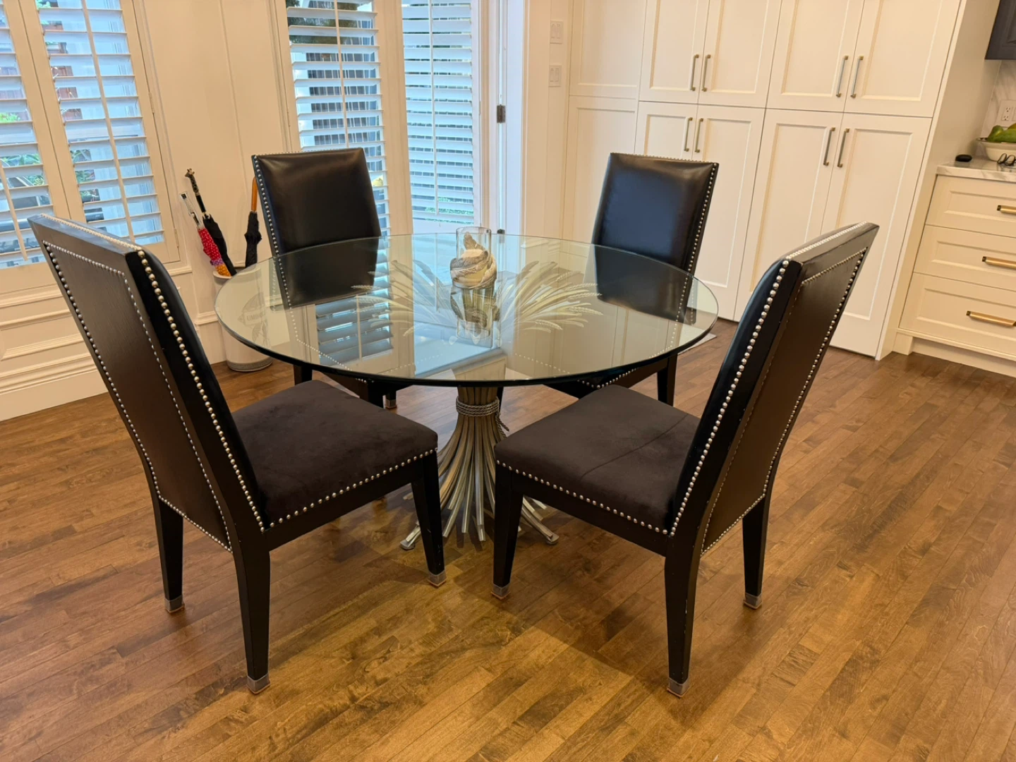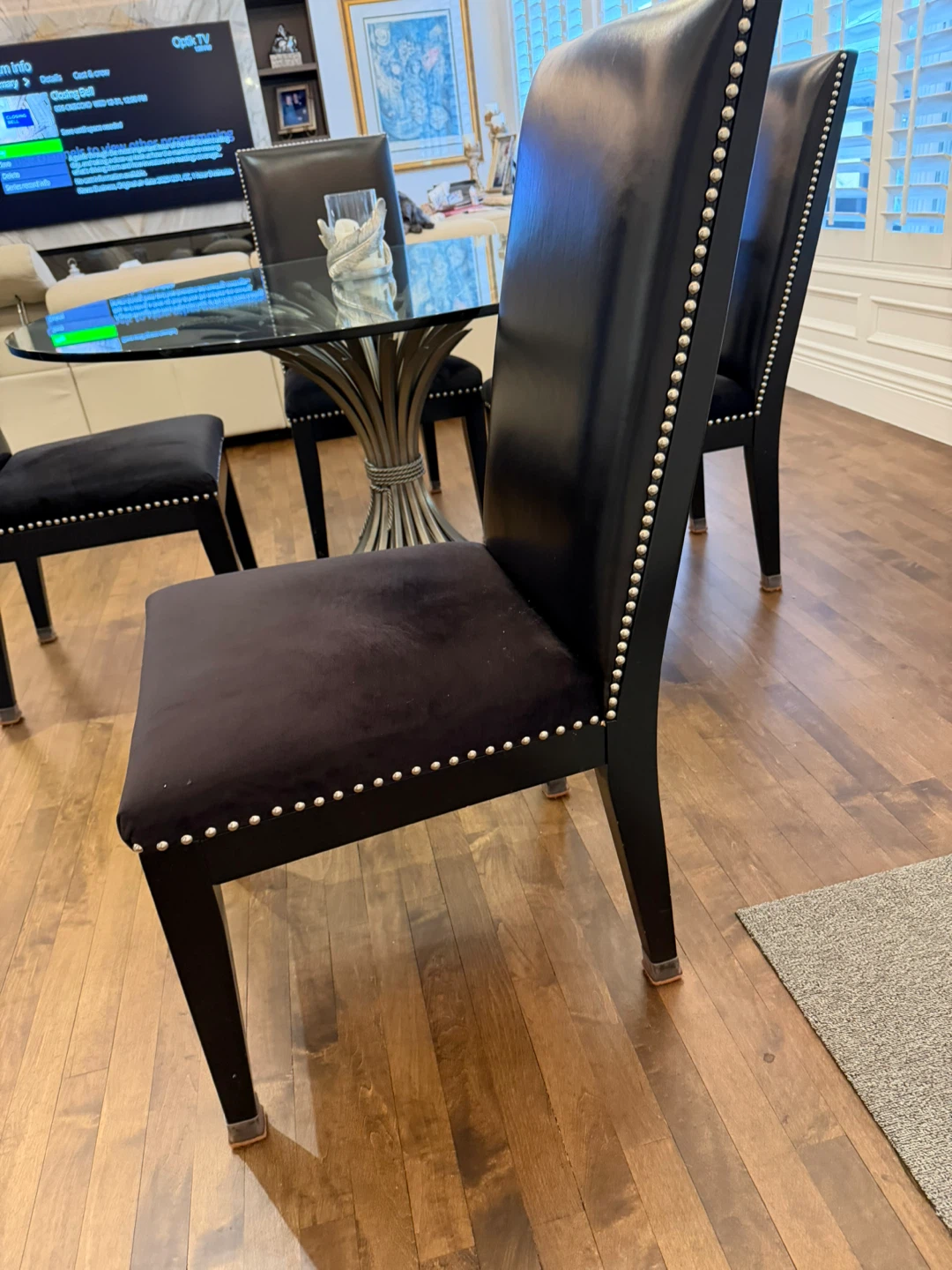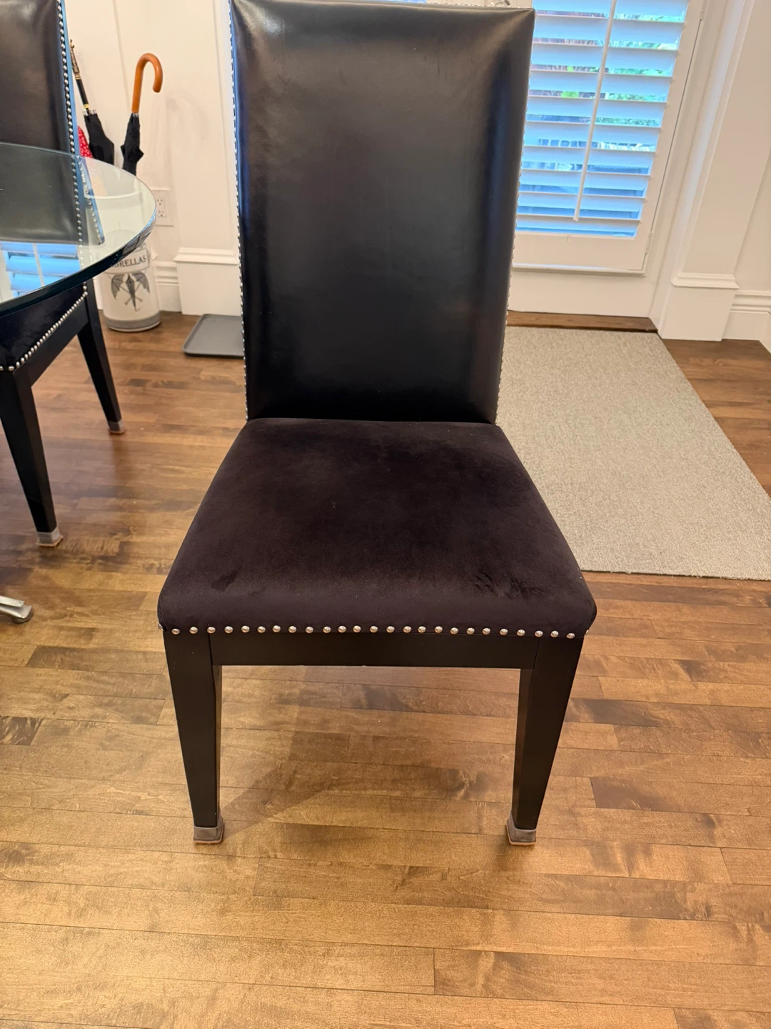 High-quality genuine leather dining chairs with plush velour seats, in excellent condition. Elegant, substantial chairs with a timeless, upscale look — not bonded or faux leather.