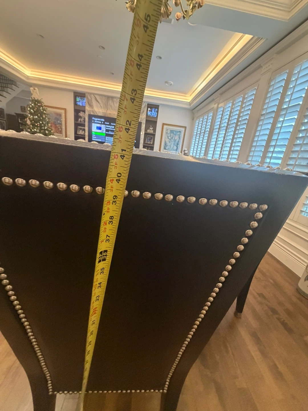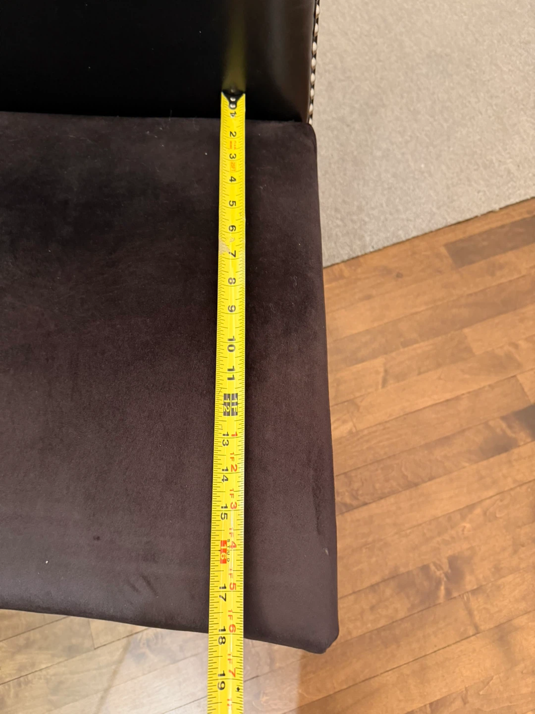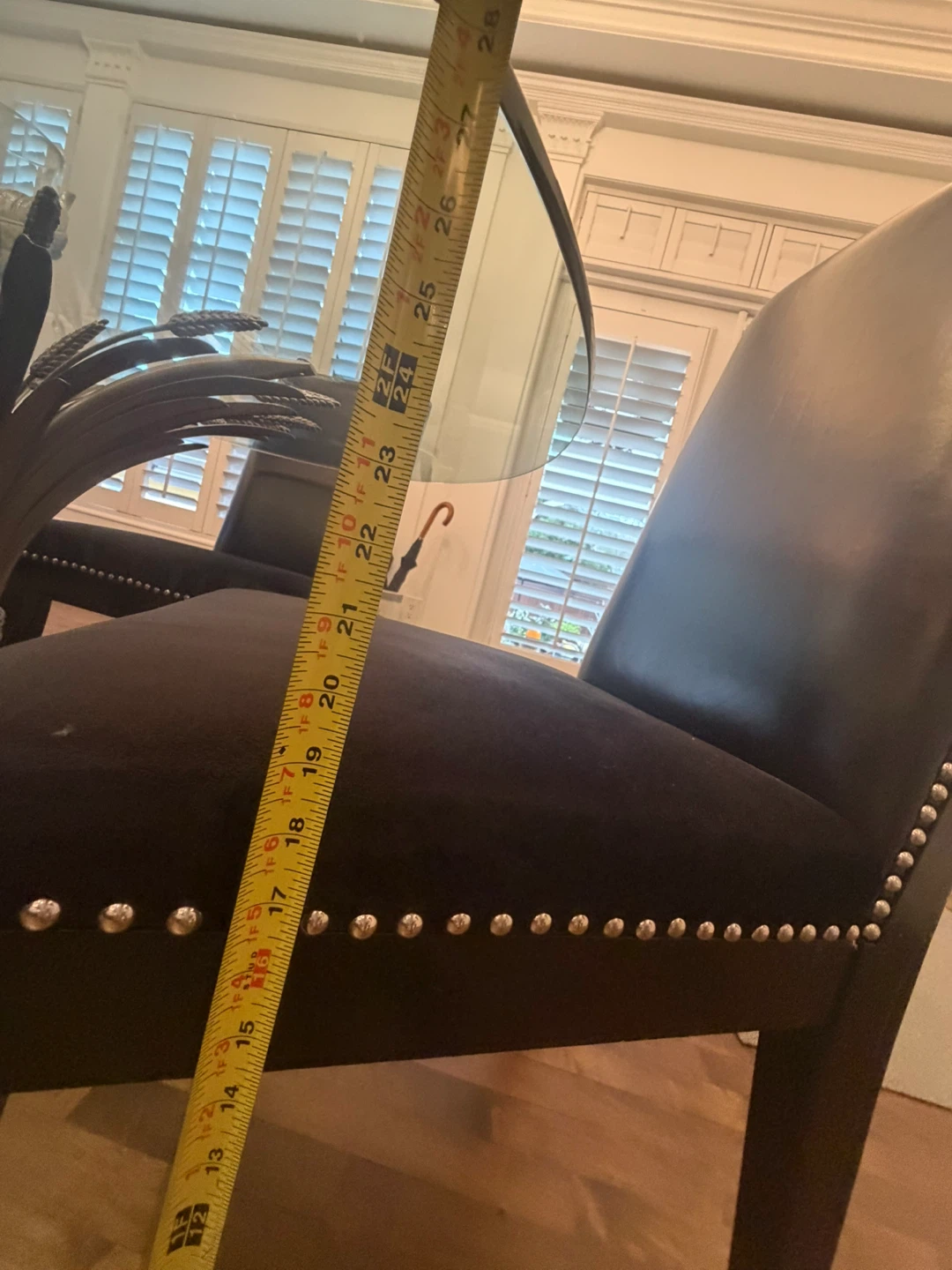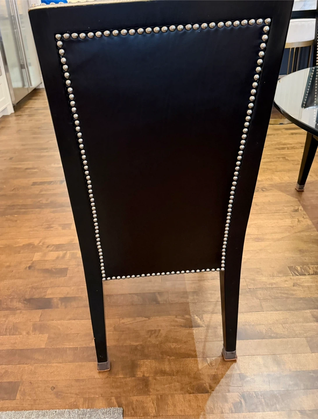 High-quality genuine leather dining chairs with plush velour seats, in excellent condition. Elegant, substantial chairs with a timeless, upscale look — not bonded or faux leather.