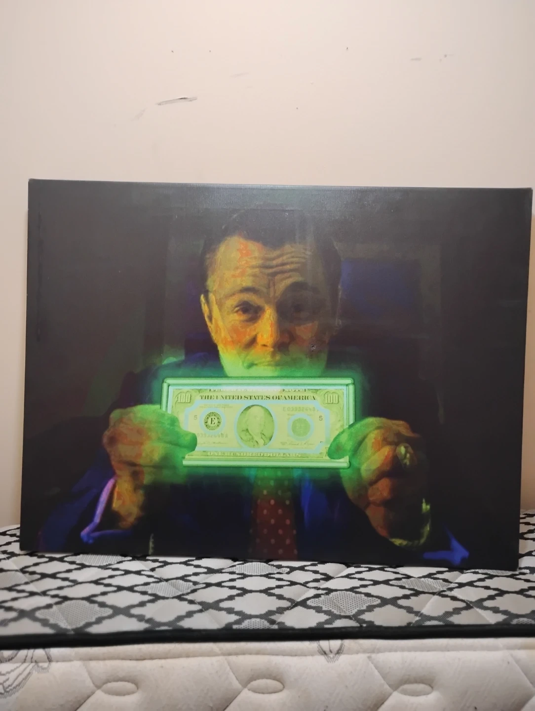 Leanordo Decaprio art piece from Wolf of Wall Street. Holding up a $100 bill which seems to glow. Has a whamo on left cheek someone fixed. Can hardly tell. Still an awesome price for a Leo fan.