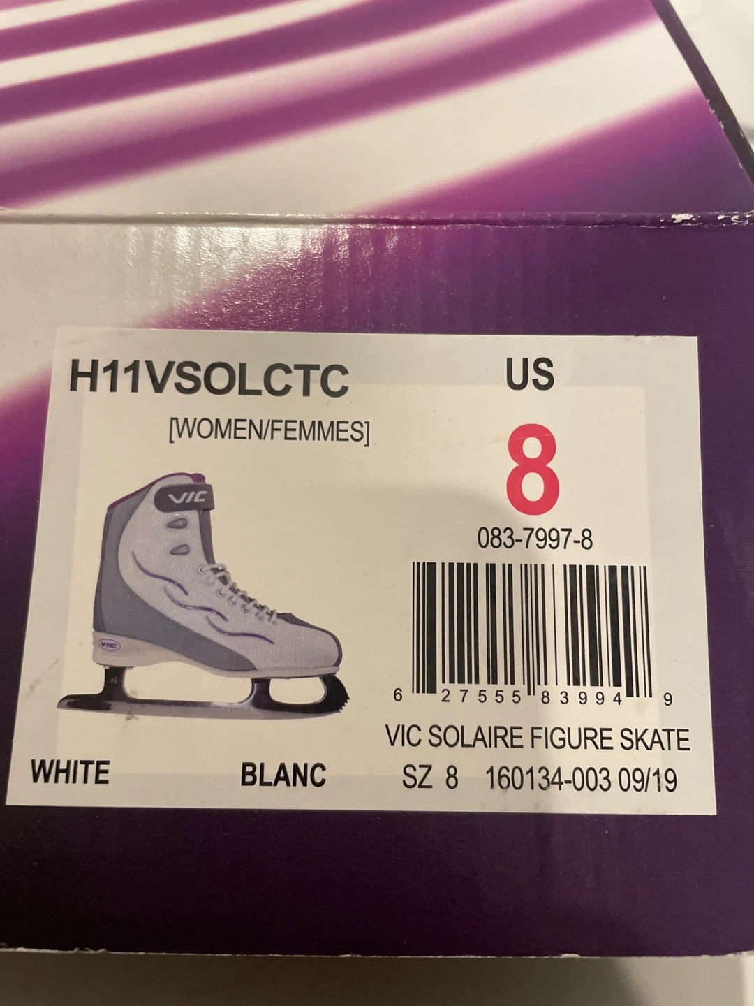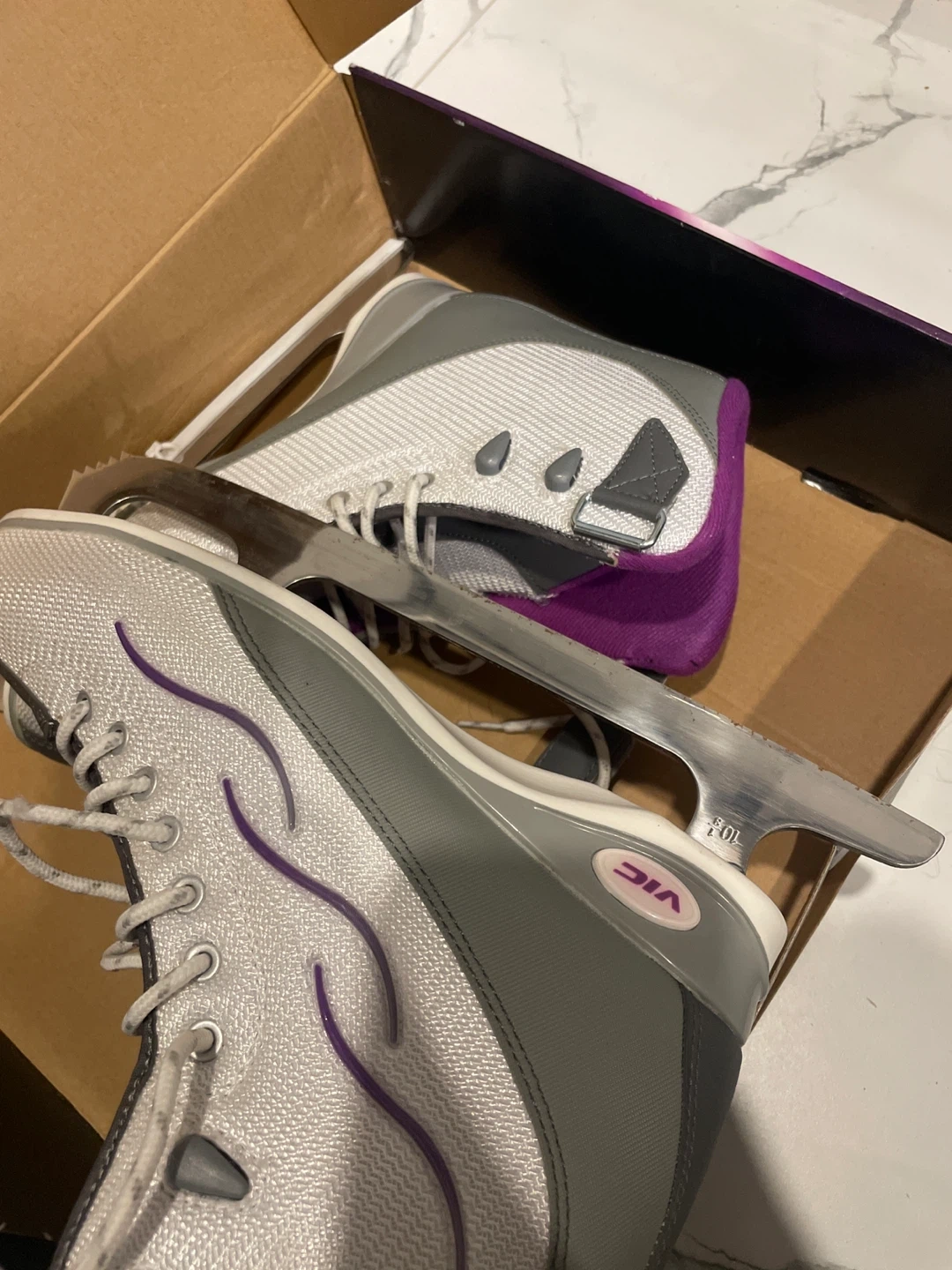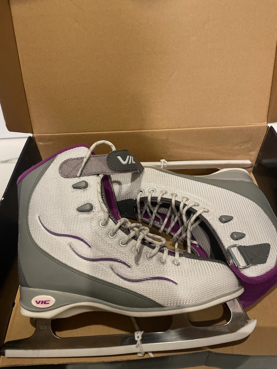 Selling a pair of VIC Solaire figure skates in women's size US 8. They come in their original box! The skates are white with purple accents, and are in great shape.
