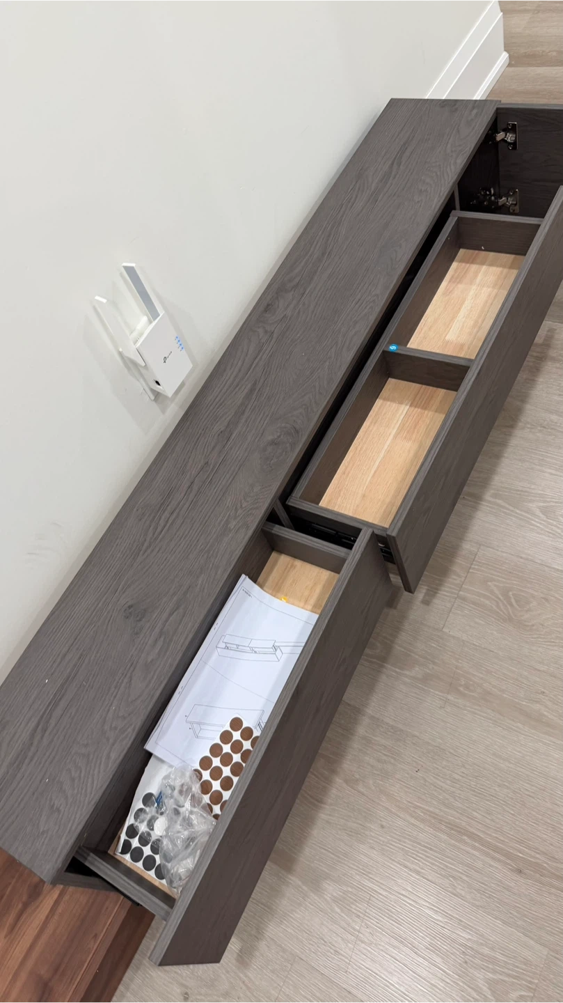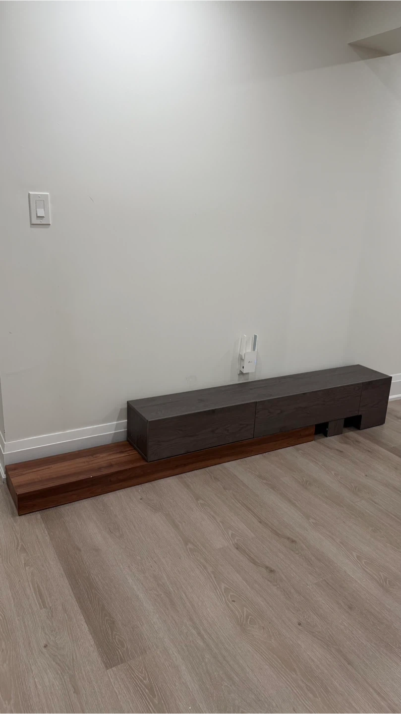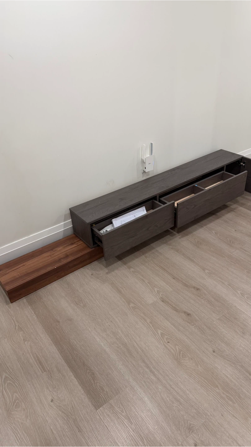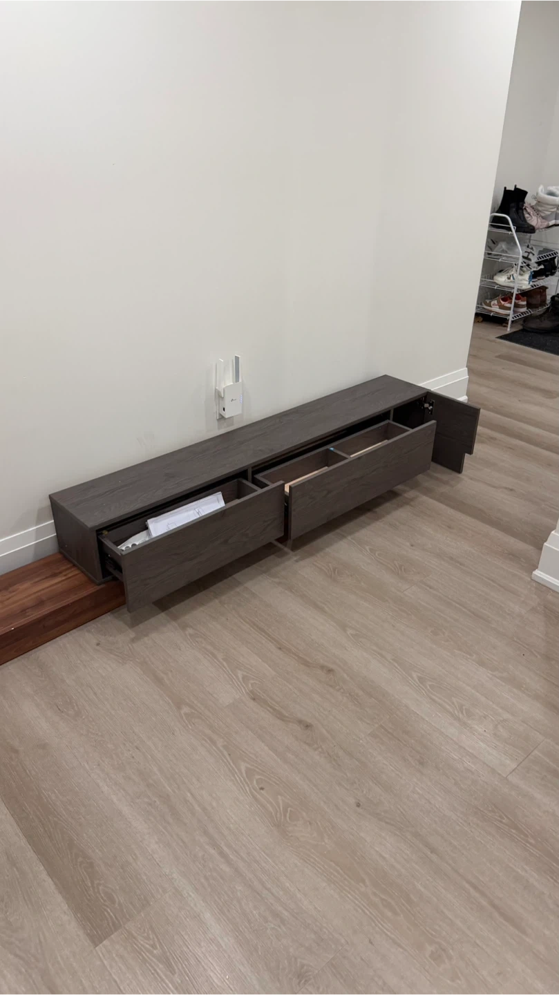 Selling a dark brown TV console. It has a sleek design and offers great storage with its built-in drawers. Perfect for any living room setup!