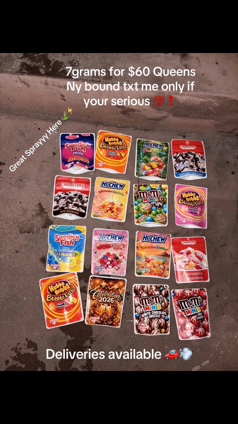 I'm selling an assortment of sprayed weed. 7 grams only, including Hi-Chew, Swedish Fish mini Glow Ups, M&M's minis, Hubba Bubba Bubble Tape, and Cold Stone Creamery flavored weed ! Flavors include Oreo Overload, Birthday Cake Remix, Surrender to Strawberry, Cherry Bubble Gum. 7 Grams WEED for $60.