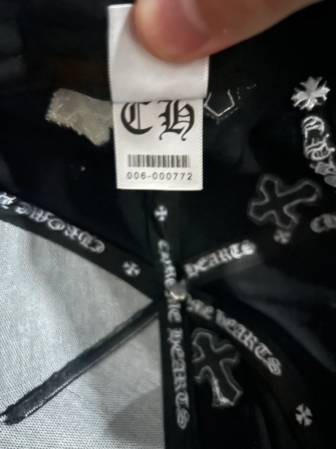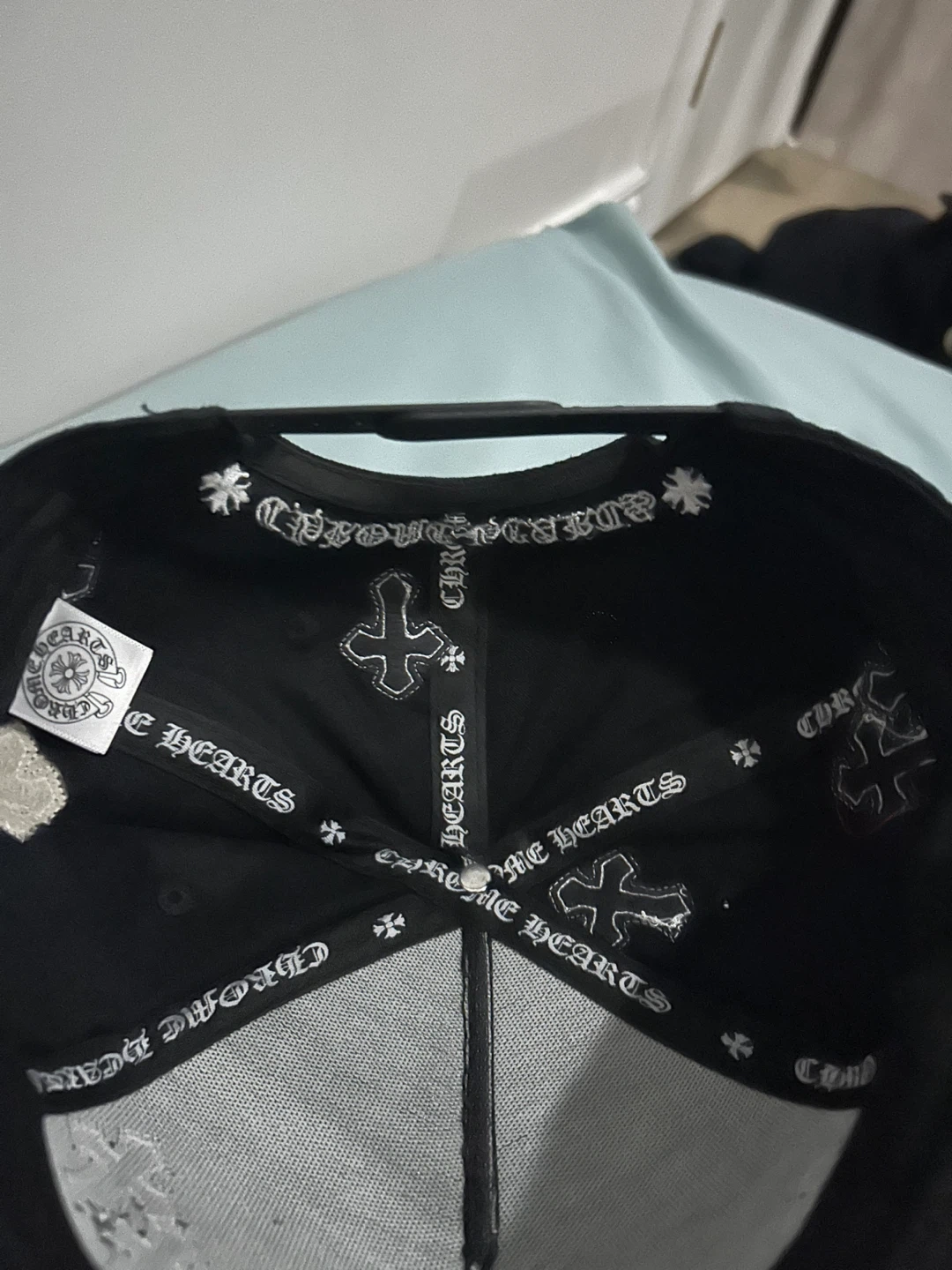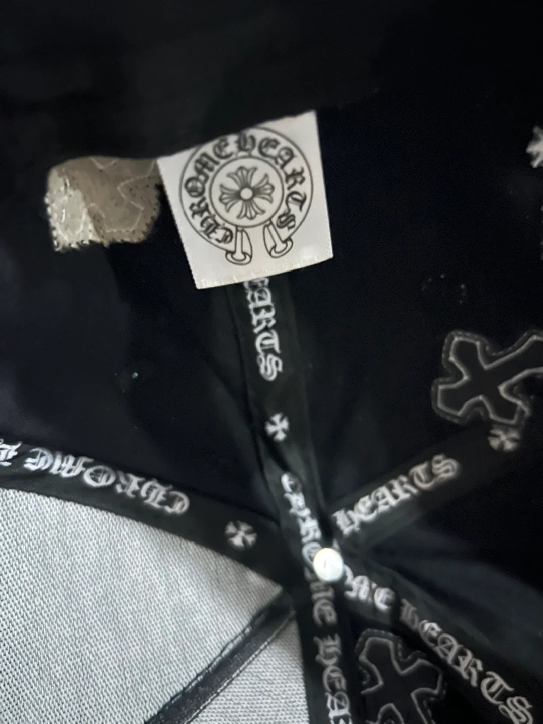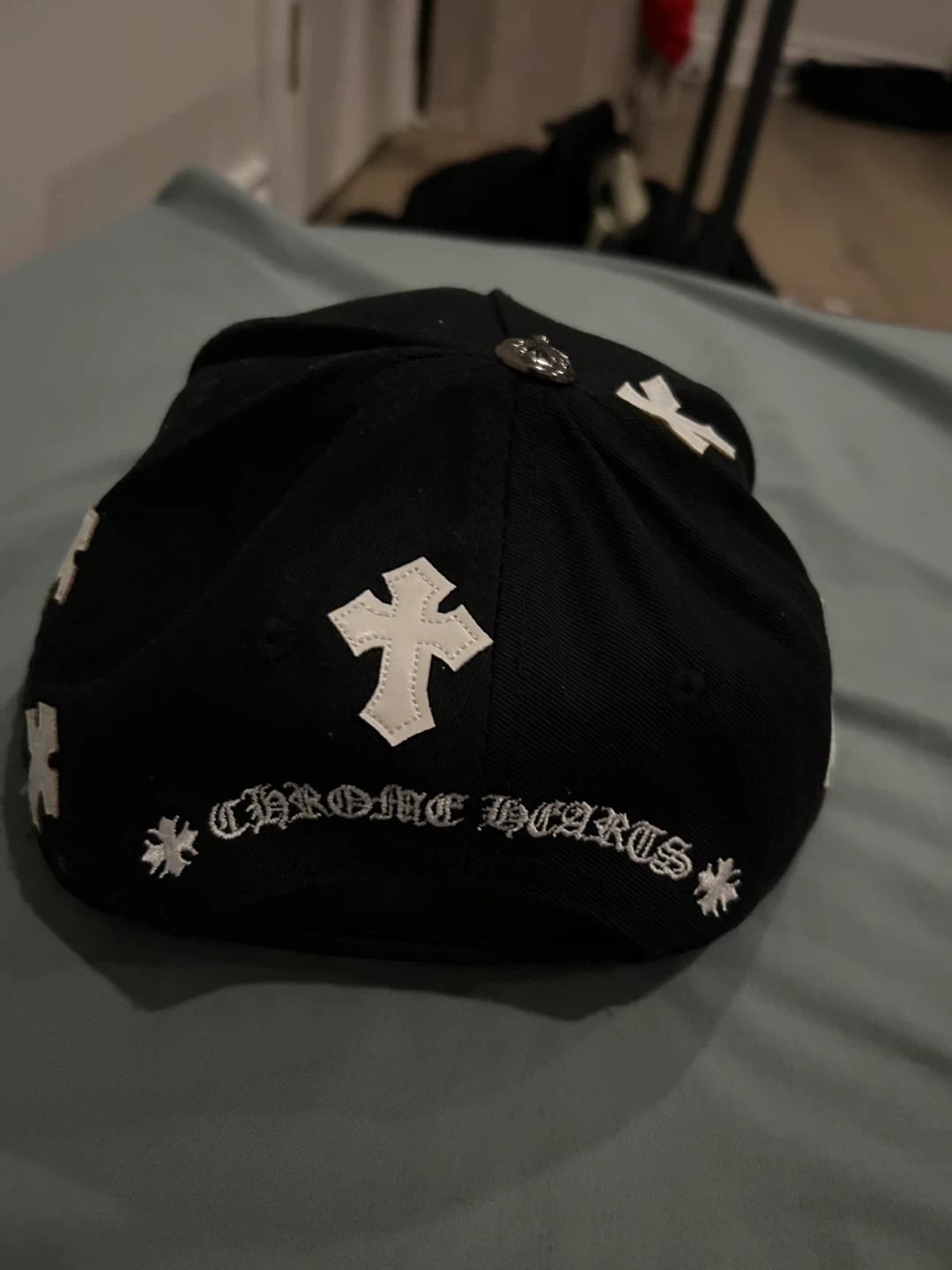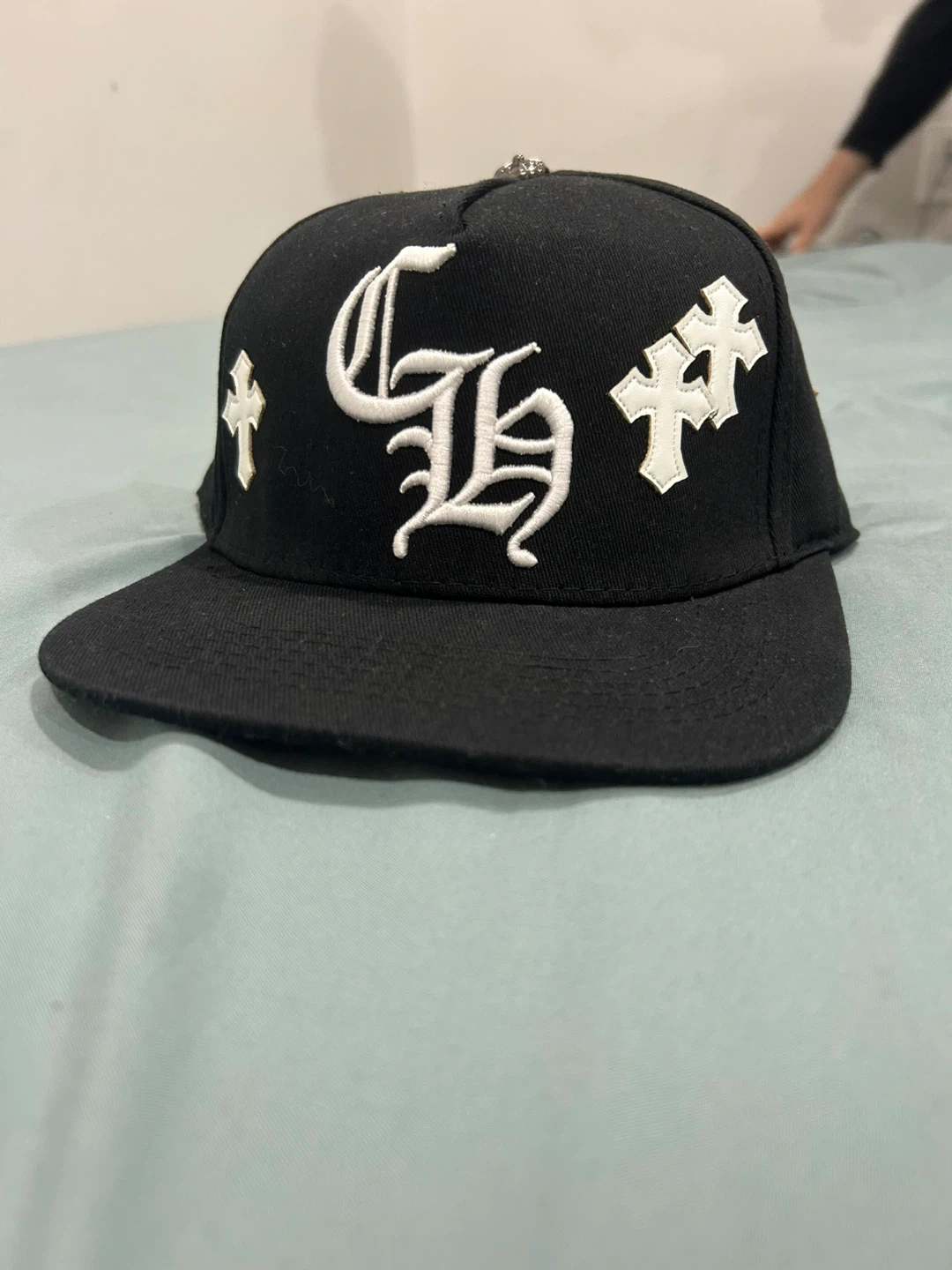 Selling a Chrome Hearts black hat. It features the iconic cross design. The hat is in good condition and ready for a new owner!