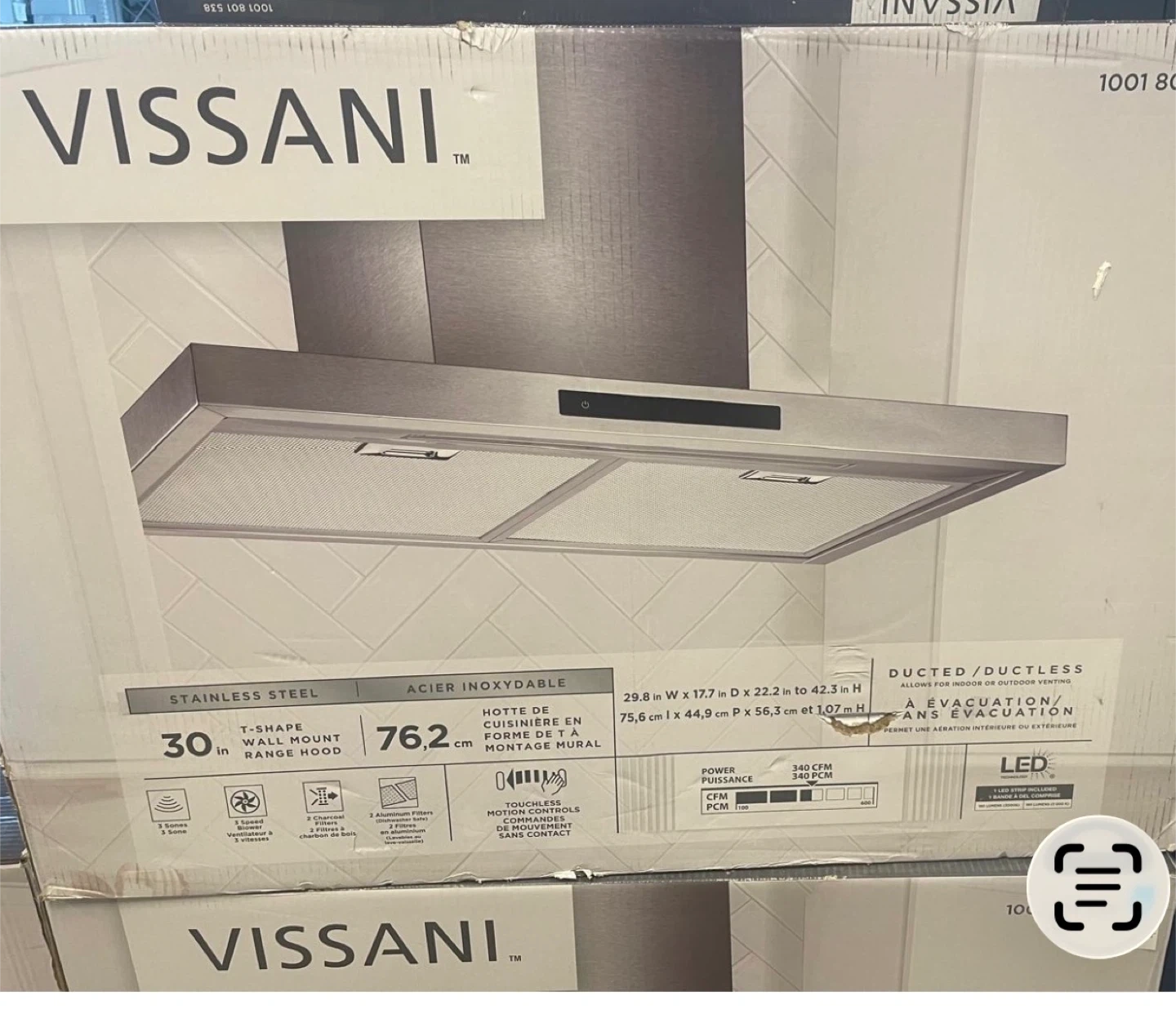 Selling a Vissani 30-inch stainless steel T-shape wall mount range hood. It has touchless motion controls and includes 2 aluminum filters. Dimensions are 29.8 in W x 17.7 in D x 22.2 in to 42.3 in H. Brand new never open
