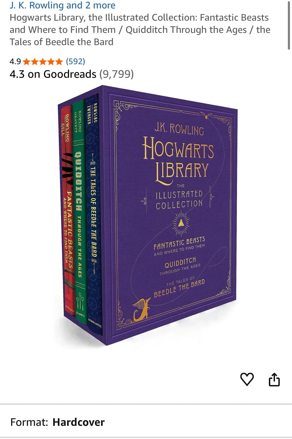 Selling a brand new Hogwarts Library: The Illustrated Collection by J.K. Rowling! This set includes Fantastic Beasts and Where to Find Them, Quidditch Through the Ages, and The Tales of Beedle the Bard. It's a hardcover edition and would make a lovely addition to any Harry Potter fan's collection
