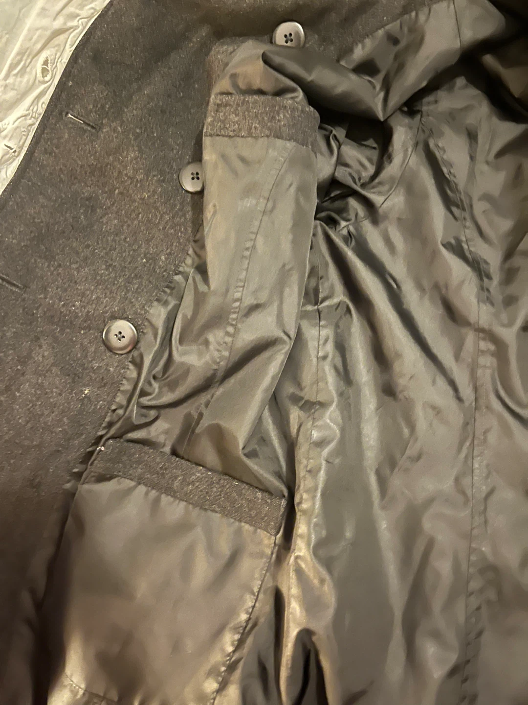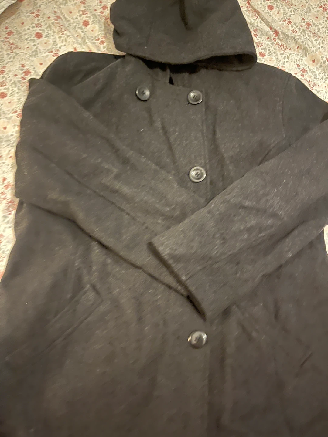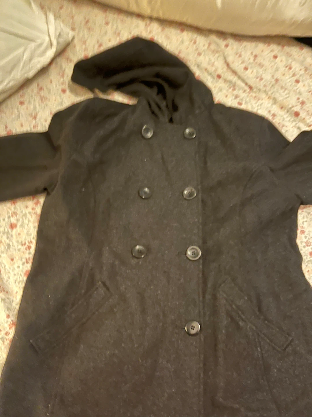 Selling a stylish black hooded coat, perfect for cooler weather! It features a double-breasted button closure and a comfortable wool blend material. The coat is in good condition and ready for a new owner