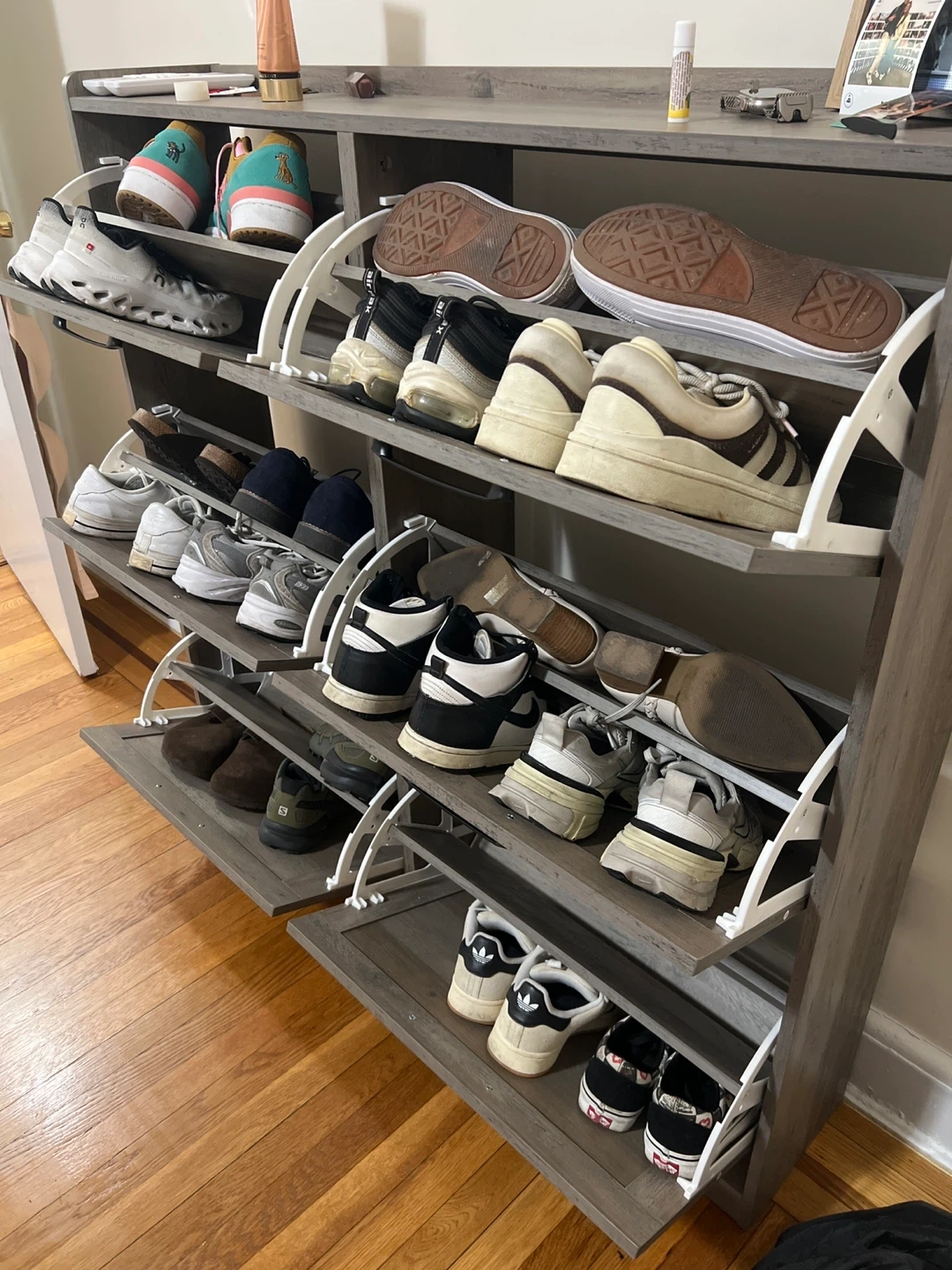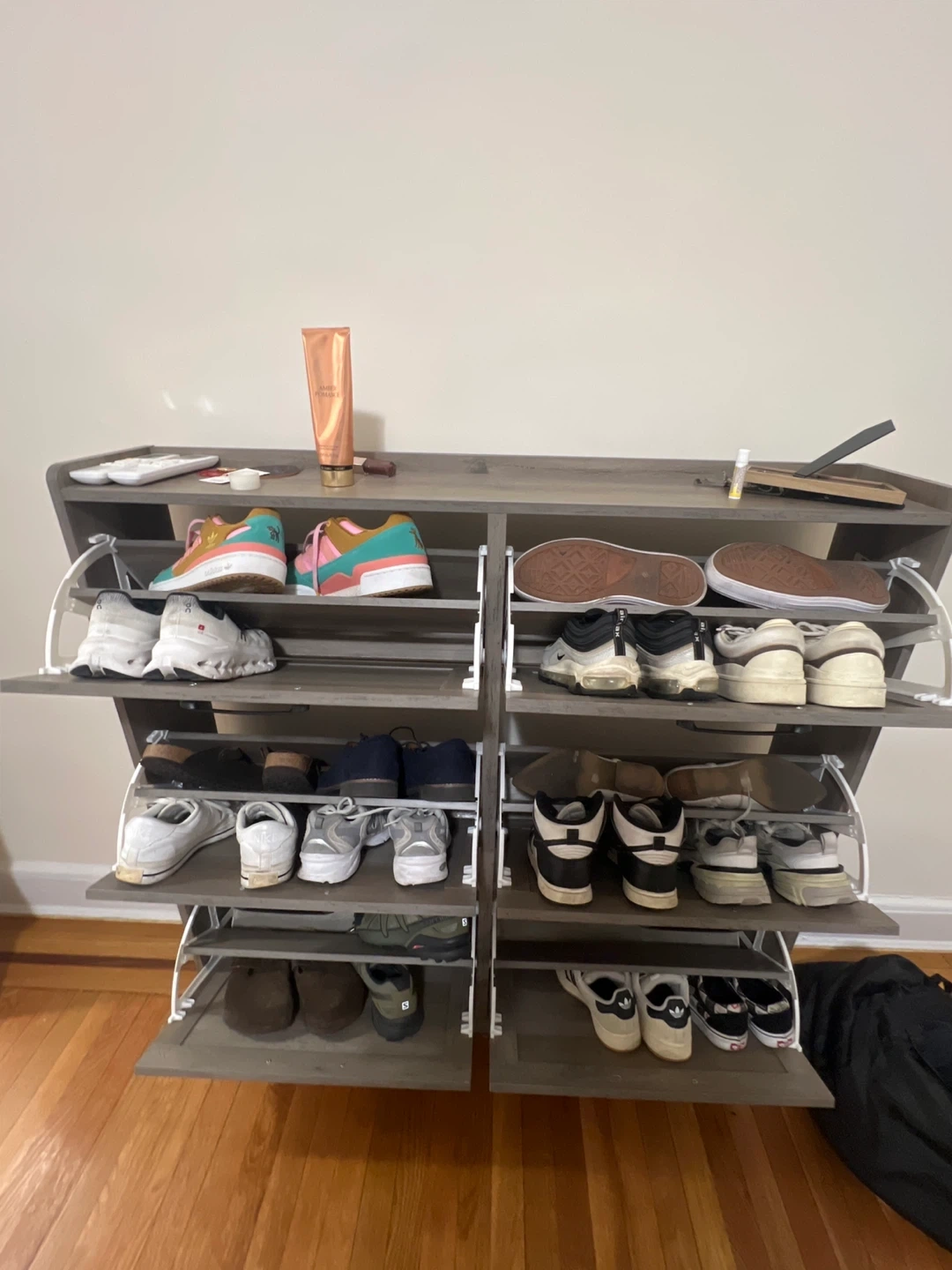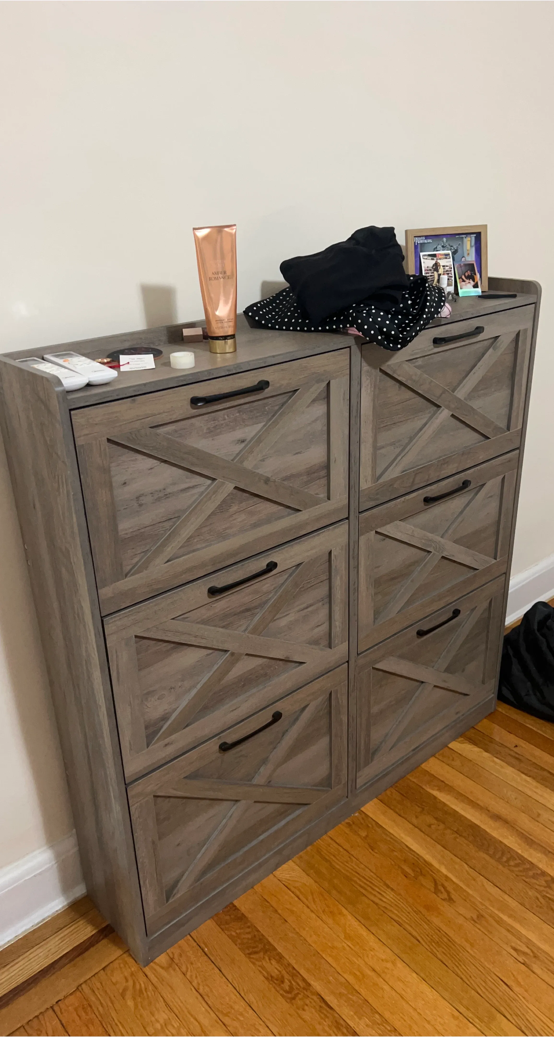 Here's a wooden shoe storage cabinet that's perfect for keeping your entryway or closet organized! It has a rustic design with a barn door style front. It's in great condition and ready to hold all your shoes