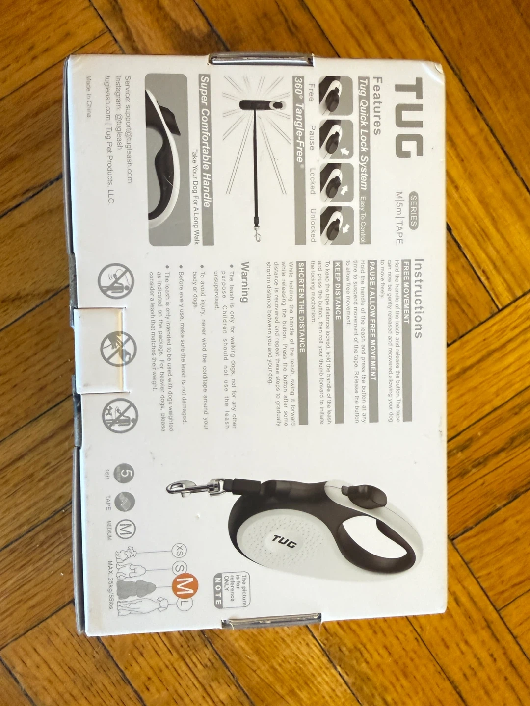 Selling a TUG Retractable Dog Leash! It has a super comfortable handle and is tangle-free. The leash is medium size and 16 ft long, perfect for dogs up to 55 lbs. It features a one-button brake and lock system for easy control. Comes with the original box!