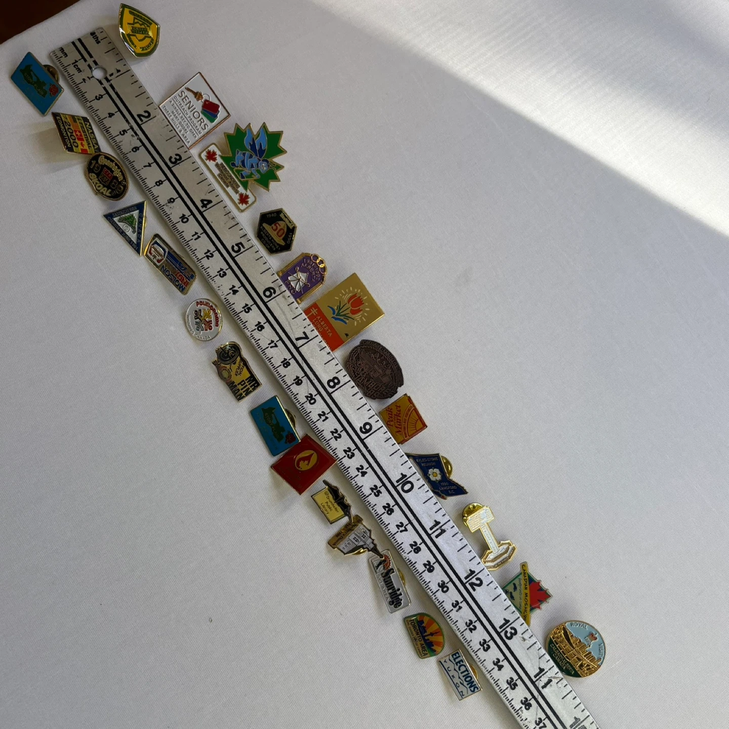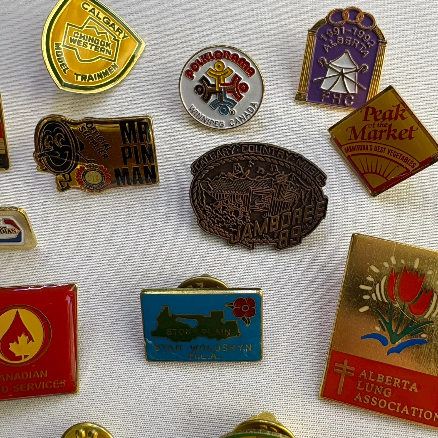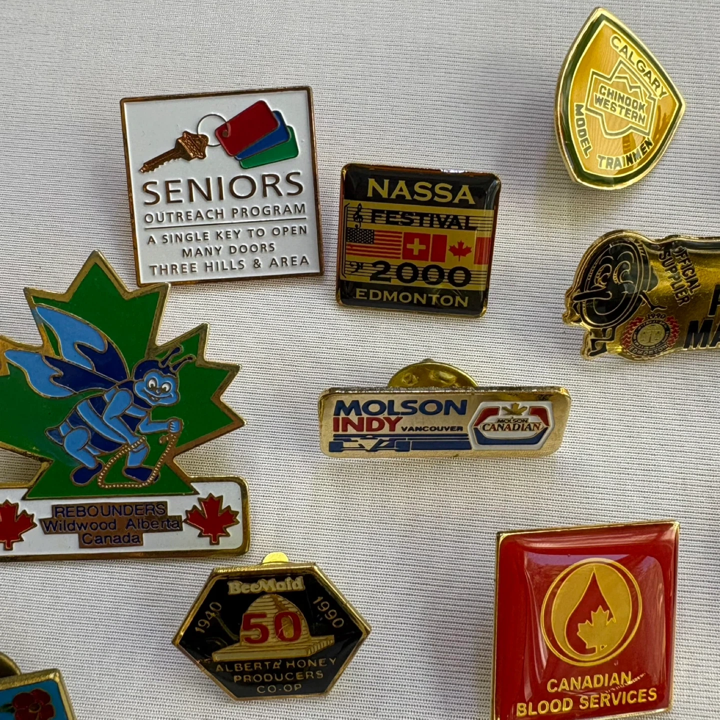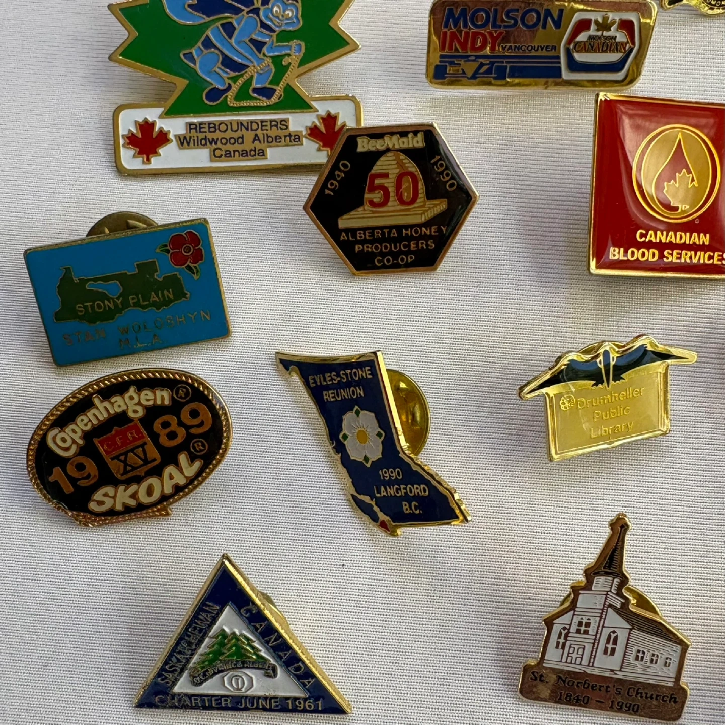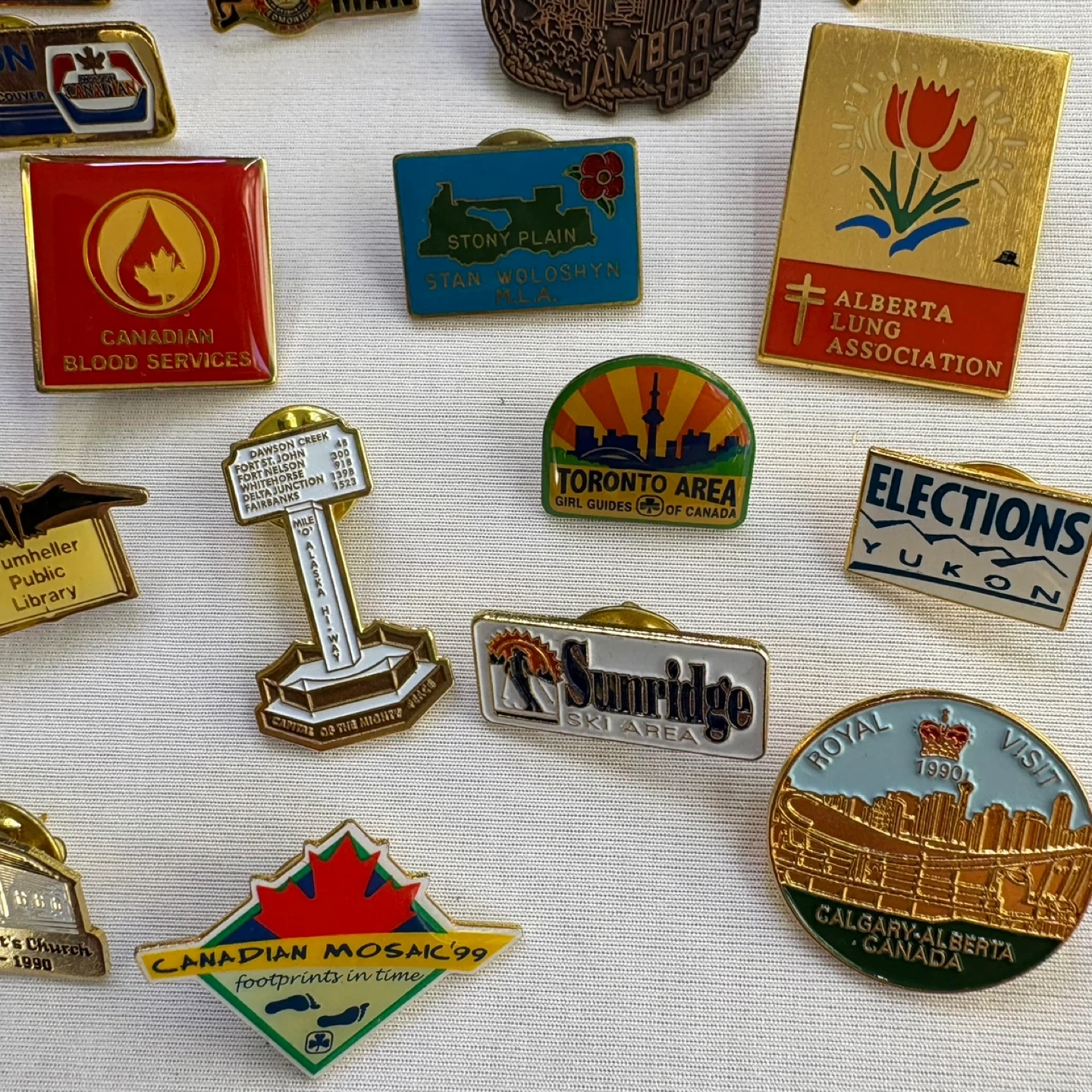vintage pins, canada collectibles, lapel pin lot, alberta pins, edmonton, calgary, toronto, yukon, vintage advertising, souvenir pins