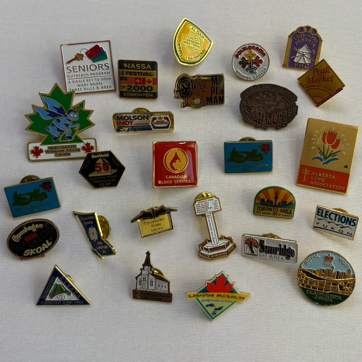 Set of 26 vintage collectible lapel pins featuring various Canadian organizations, events, and locations. Great for collectors of vintage Canadiana or pin enthusiasts.