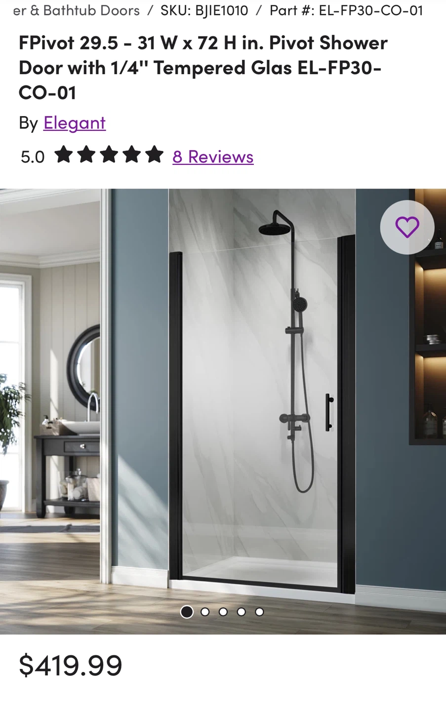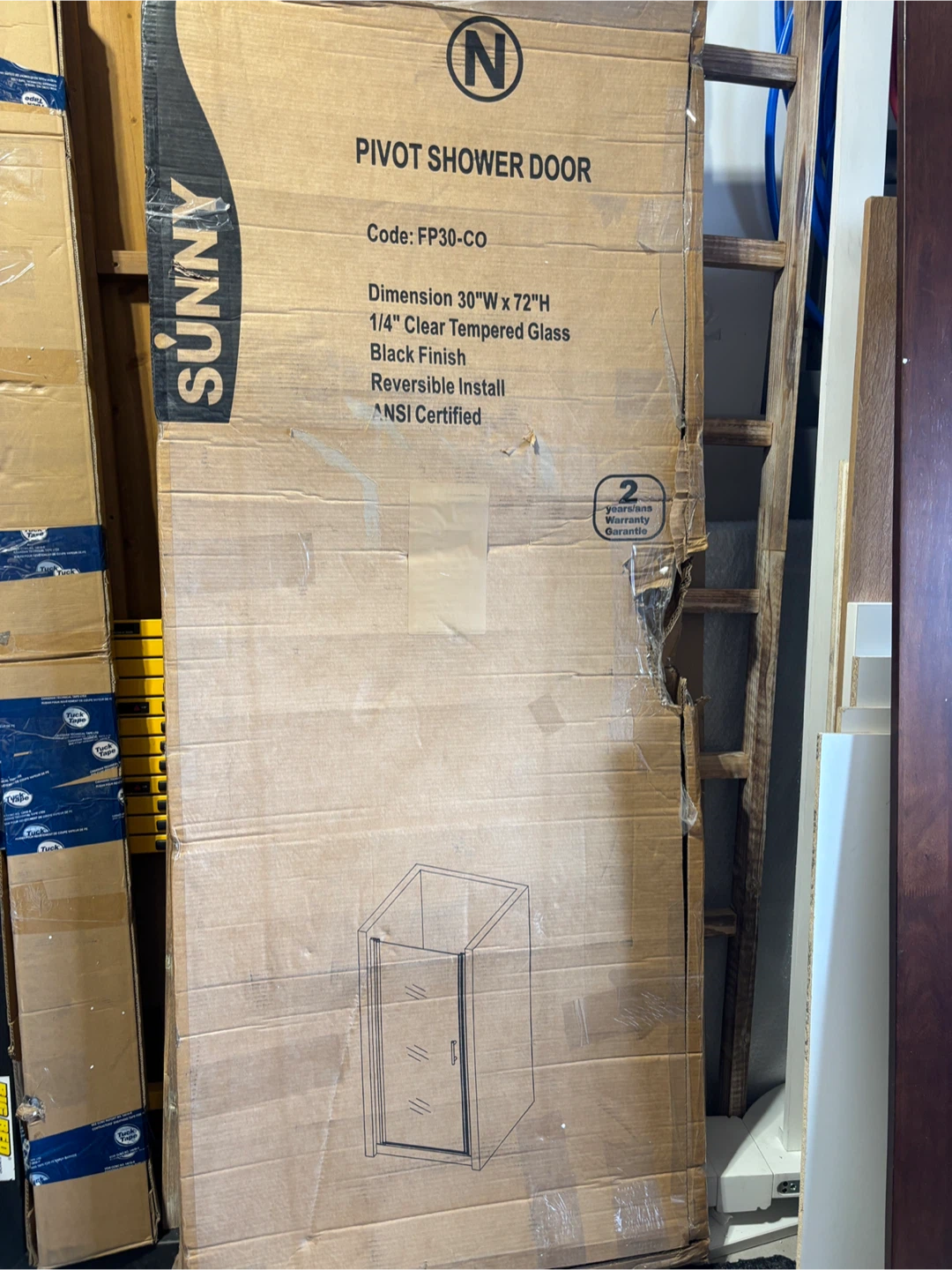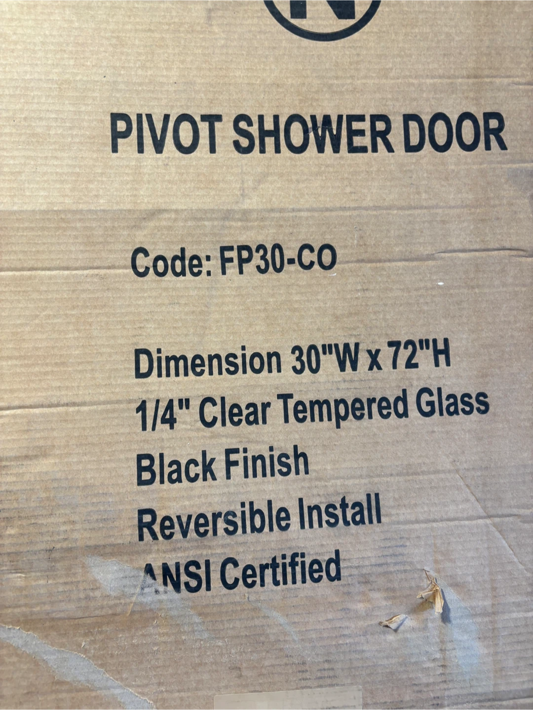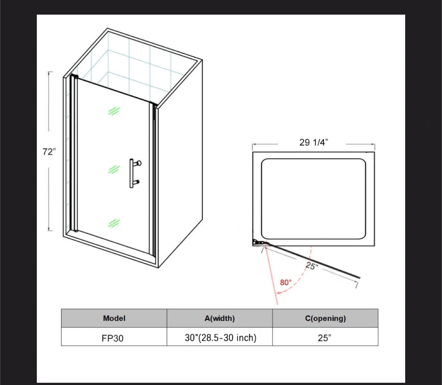Selling a Sunny Pivot Shower Door with dimensions 30"W x 72"H. It features 1/4" clear tempered glass and a sleek black finish. The door is designed for reversible installation. SHOWER DOOR DOES NOT INCLUDE HANDLE. Available for delivery and pickup