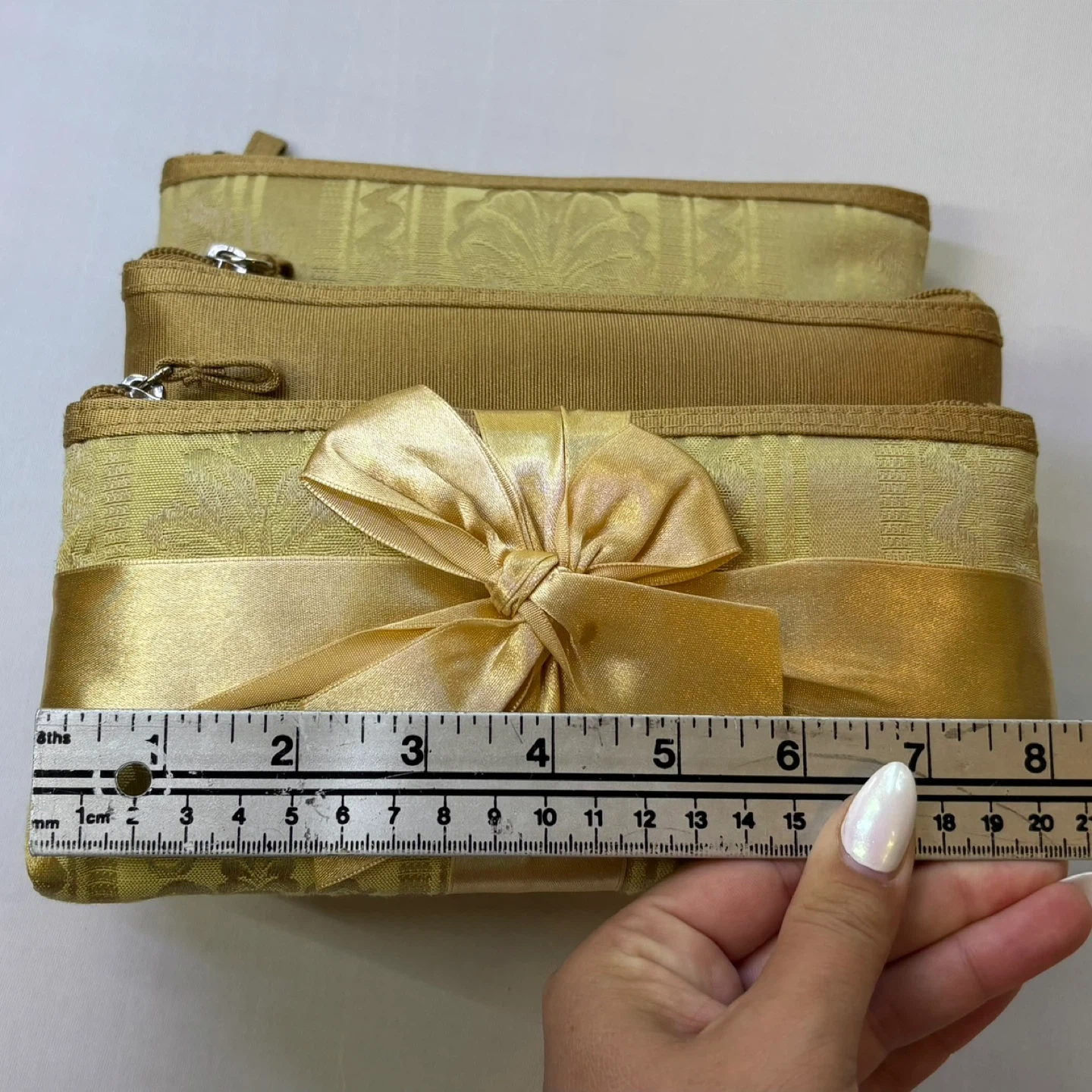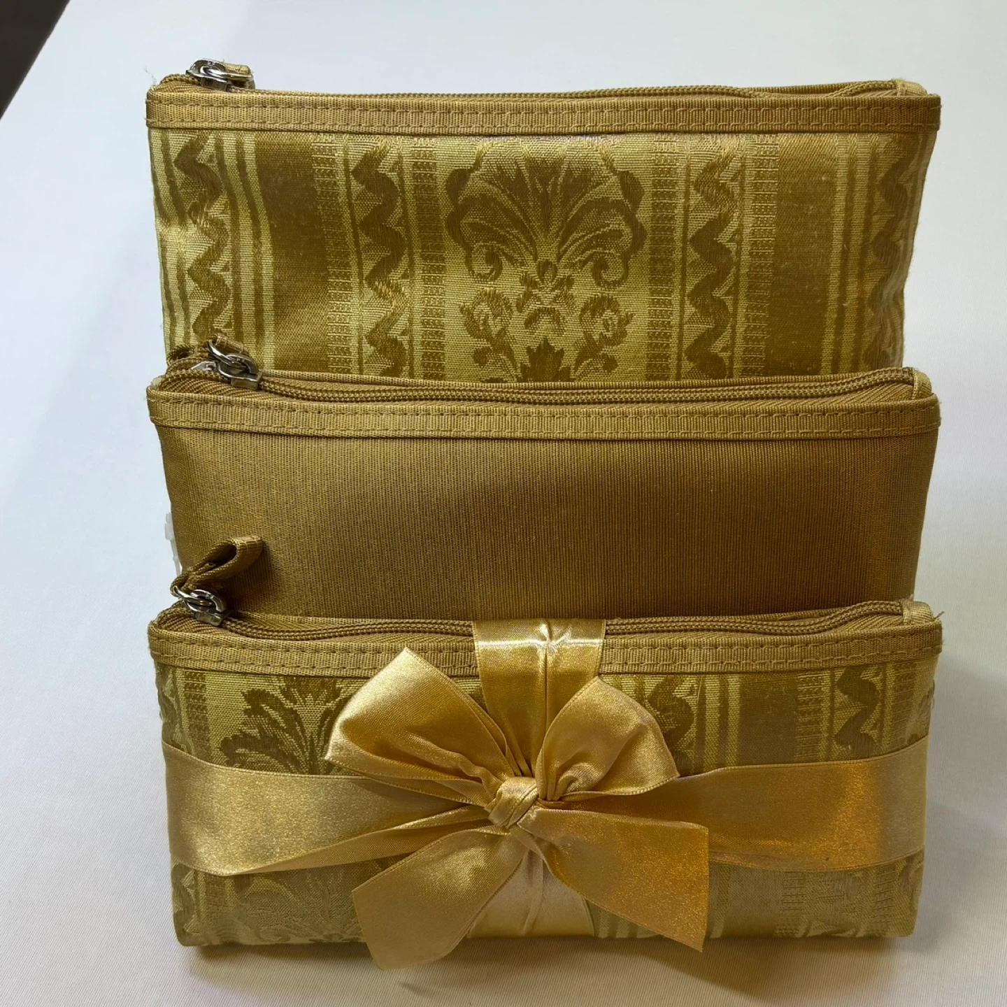 This elegant set of three nesting cosmetic bags features a shimmering gold damask brocade pattern and a solid satin-finish middle pouch. Perfect for organizing beauty essentials at home or while traveling, this brand-new set comes beautifully gift-wrapped with a matching gold satin bow.