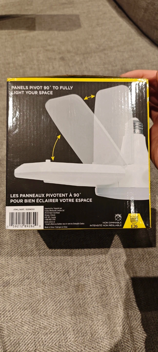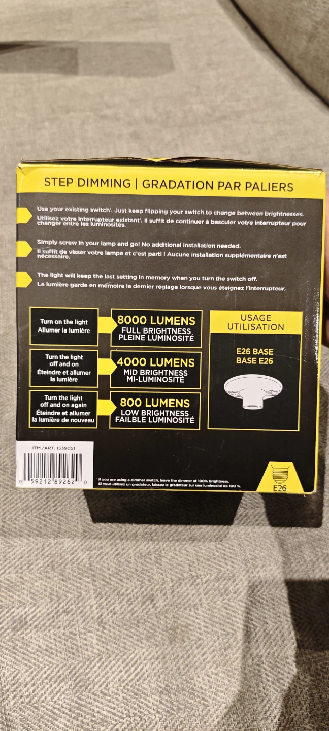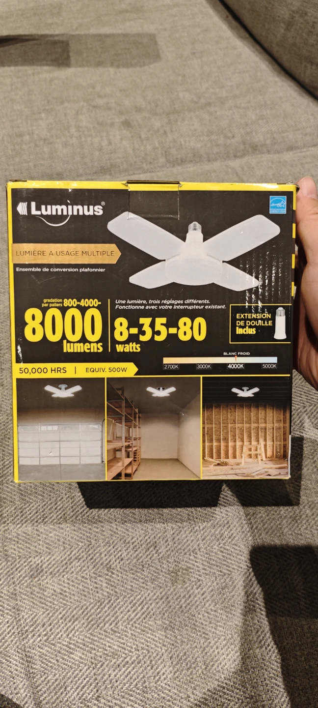 I have a brand new Luminus LED garage light still in its box. This light puts out 8000 lumens and is ready to light up your space! It's easy to install - just screw it into your existing light socket. It also has step dimming function!