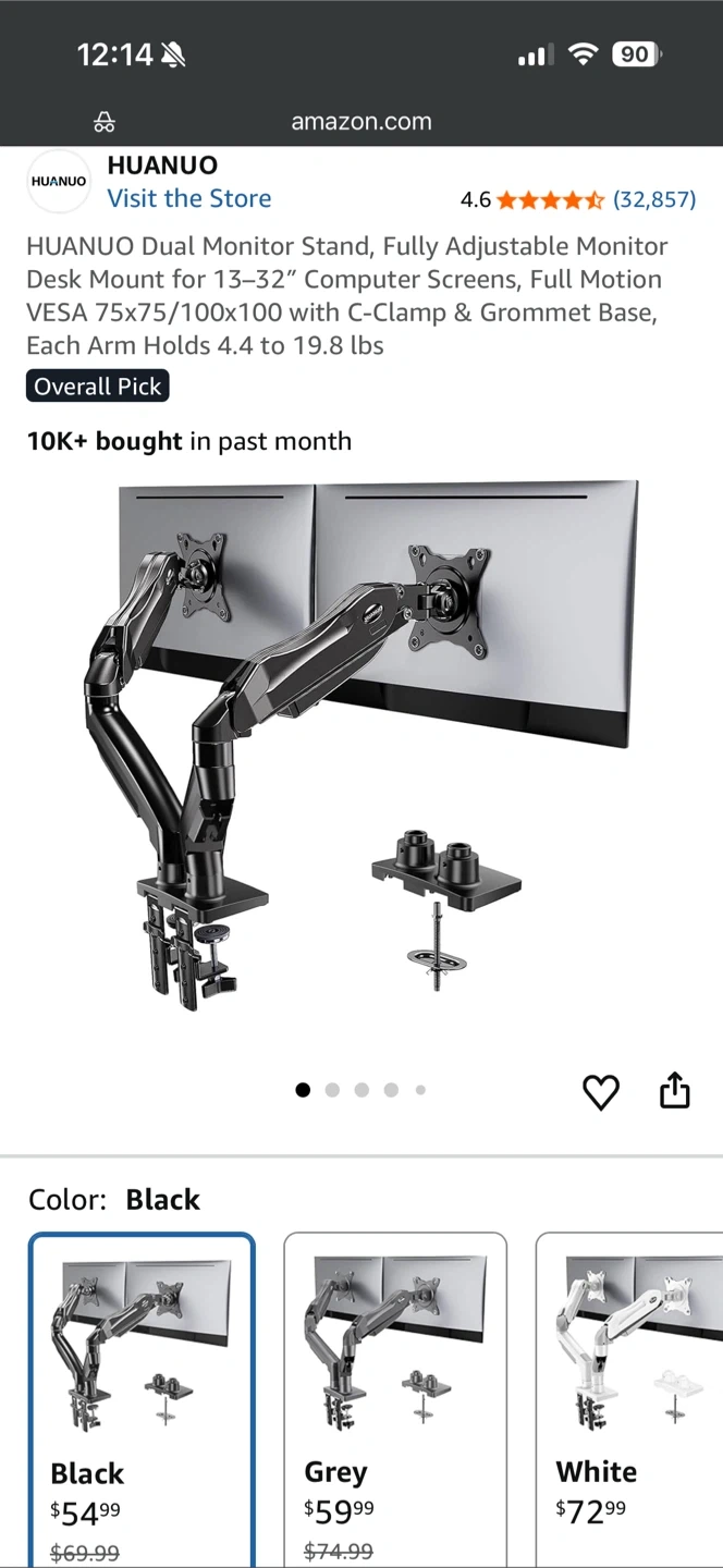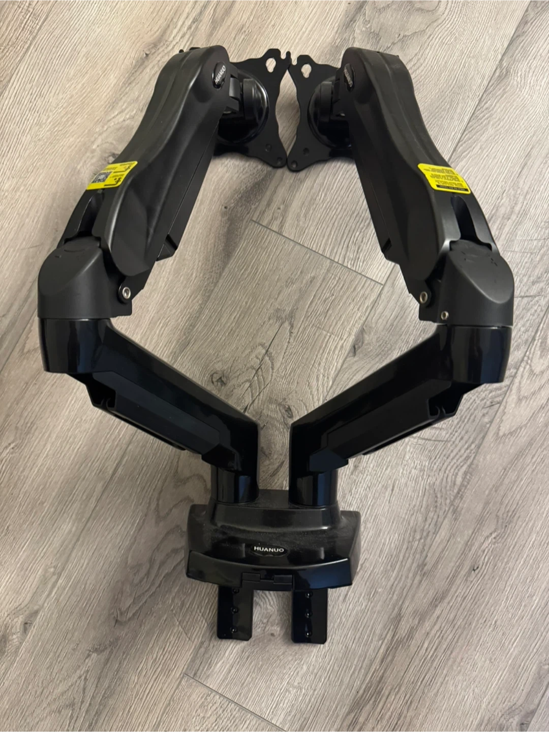 Selling a HUANUO dual monitor desk mount stand in black. It's fully adjustable and can hold monitors from 13-32 inches. It has a C-clamp and grommet base, and each arm can hold 4.4 to 19.8 lbs. Great for setting up a dual monitor workstation!