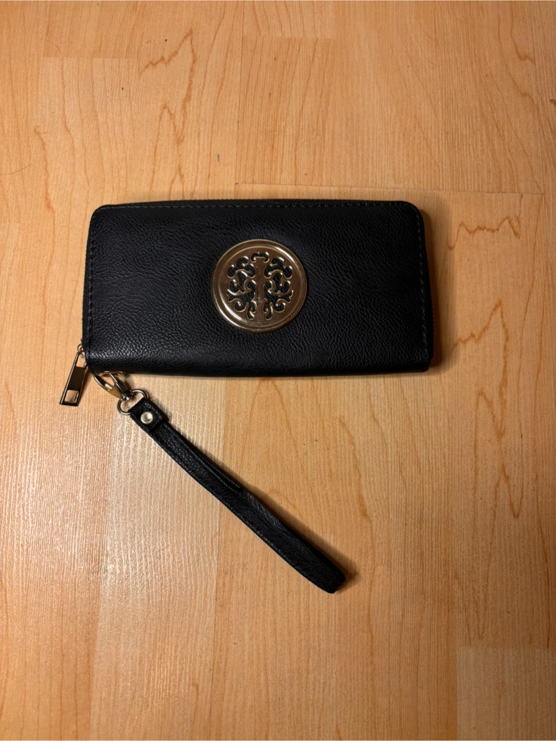 Features a zip-around closure, detachable wrist strap, and gold-tone decorative emblem on the front.