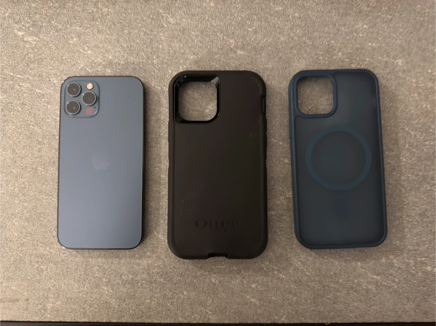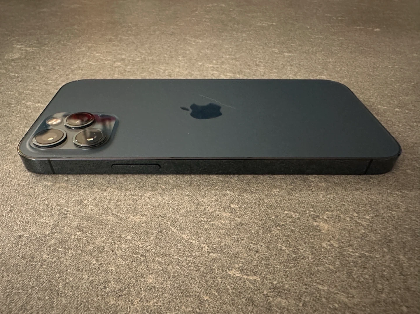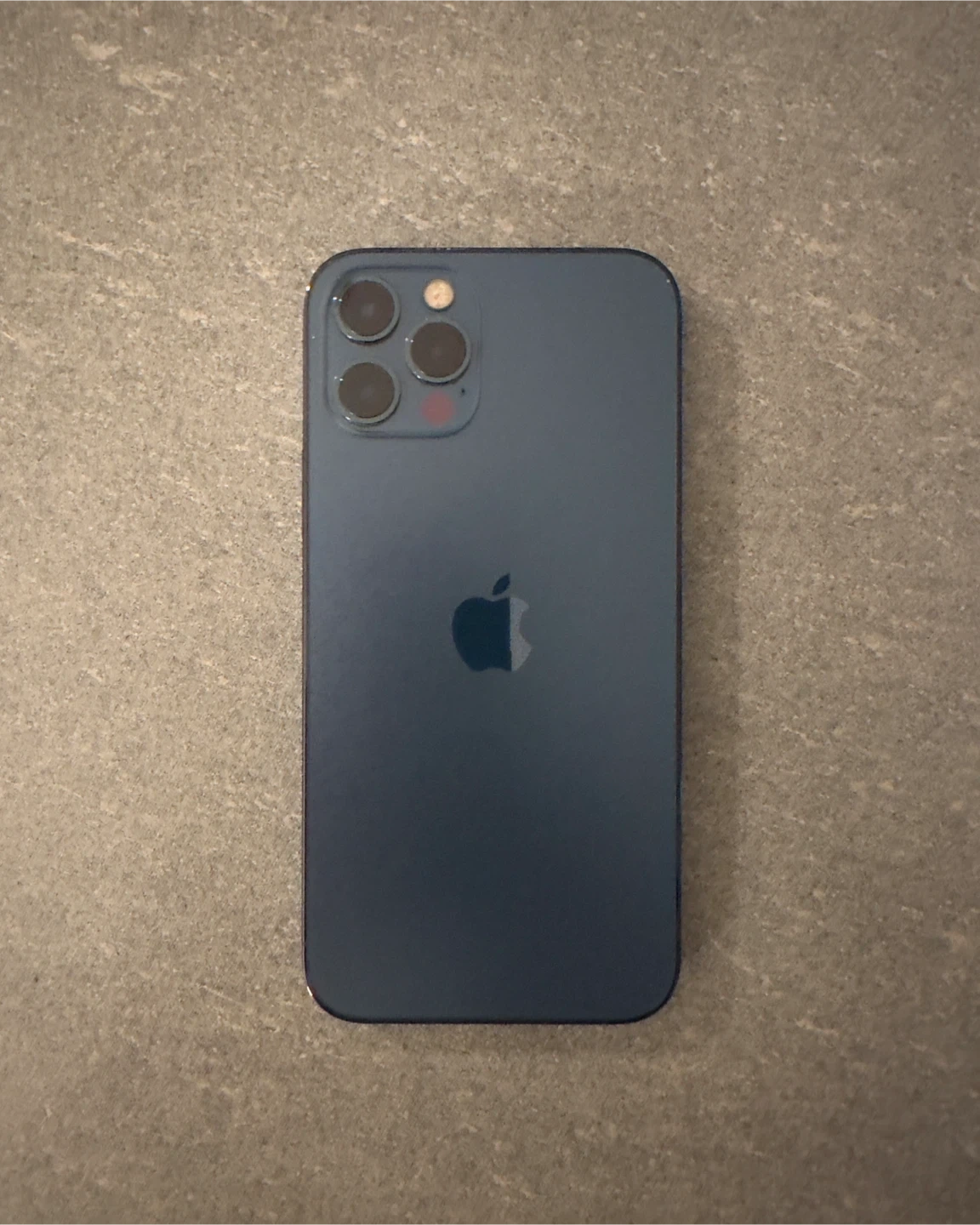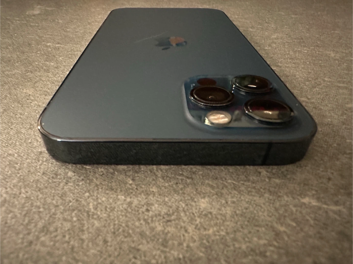 iPhone 12 Pro in Pacific Blue. 128GB storage and 73% battery health. Fair condition with minor screen scratches from normal use. Telephoto camera does not autofocus, all other cameras work properly. Two cases included with purchase.