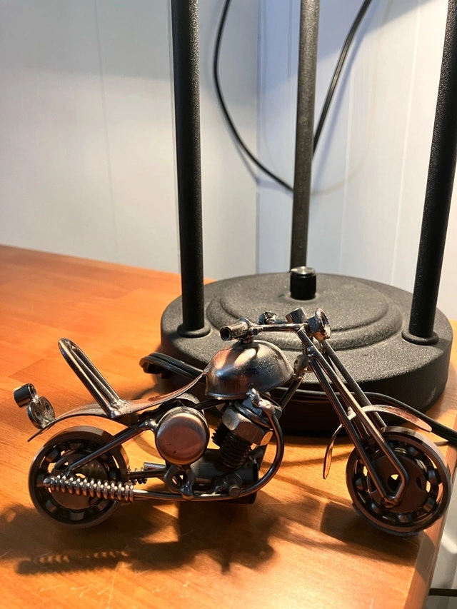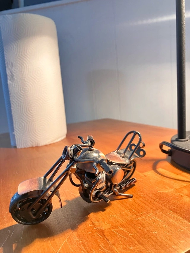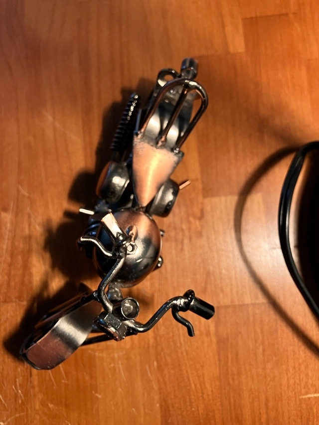 This metal motorcycle sculpture is a cool piece for any motorcycle enthusiast! As a used item, it has some slight wear, but it's still a unique decorative piece. It is carefully crafted with intricate details. A fun fact, this sculpture was designed by a Canadian Artist in 2010! Don't miss out on adding this unique piece to your collection! If the ad's still up, it's still up for grabs!