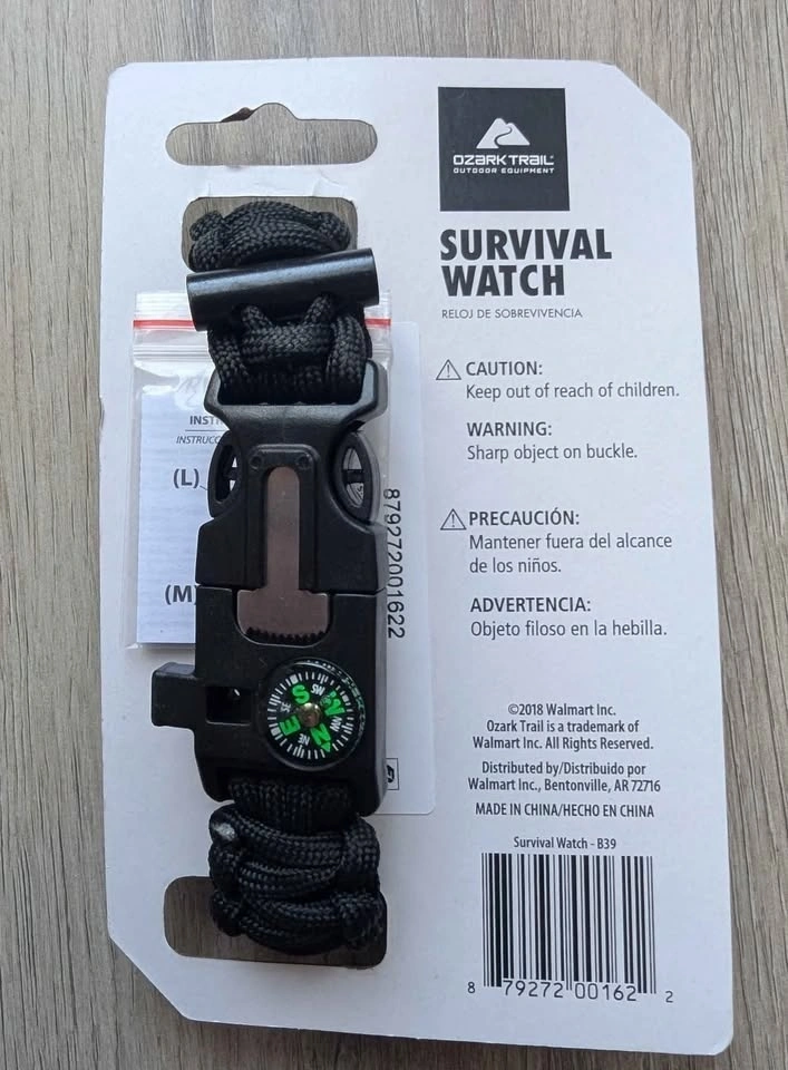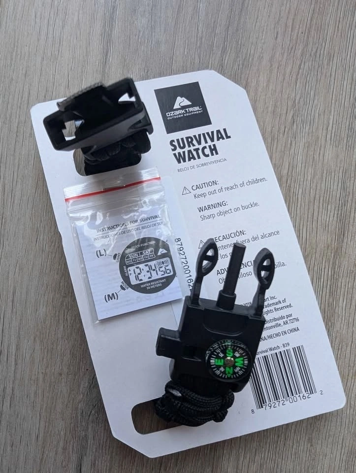 Brand new. Never used. Never worn survival watch 5-in-1. Can be great gift for outdoors person or kids that like to go camping and play survival games.