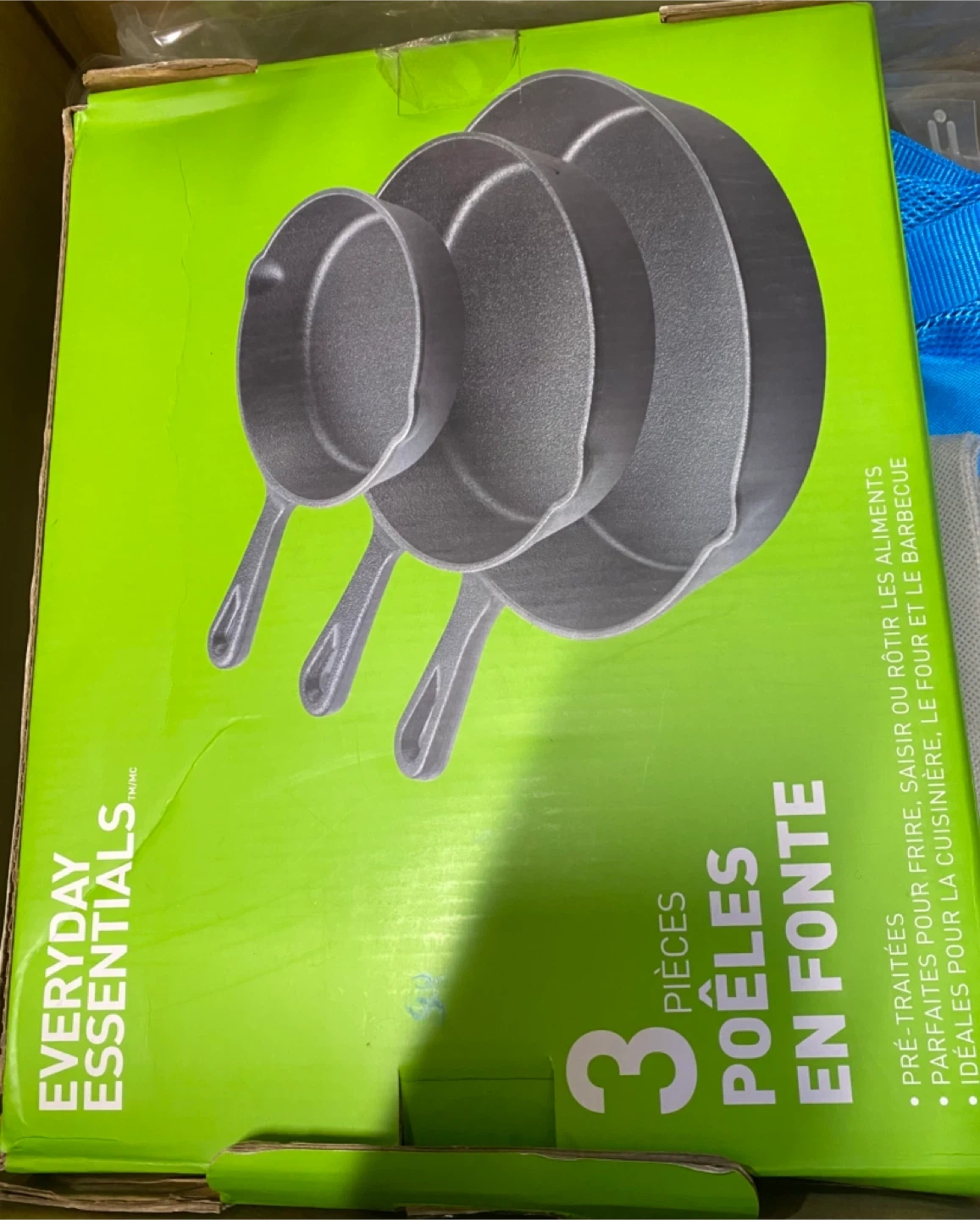 I'm selling a brand new Everyday Essentials 3-piece cast iron skillet set! This set includes three skillets perfect for frying, searing, or roasting. They are also ideal for use on the stove, in the oven, or on the barbecue. Get ready to cook up a storm!
