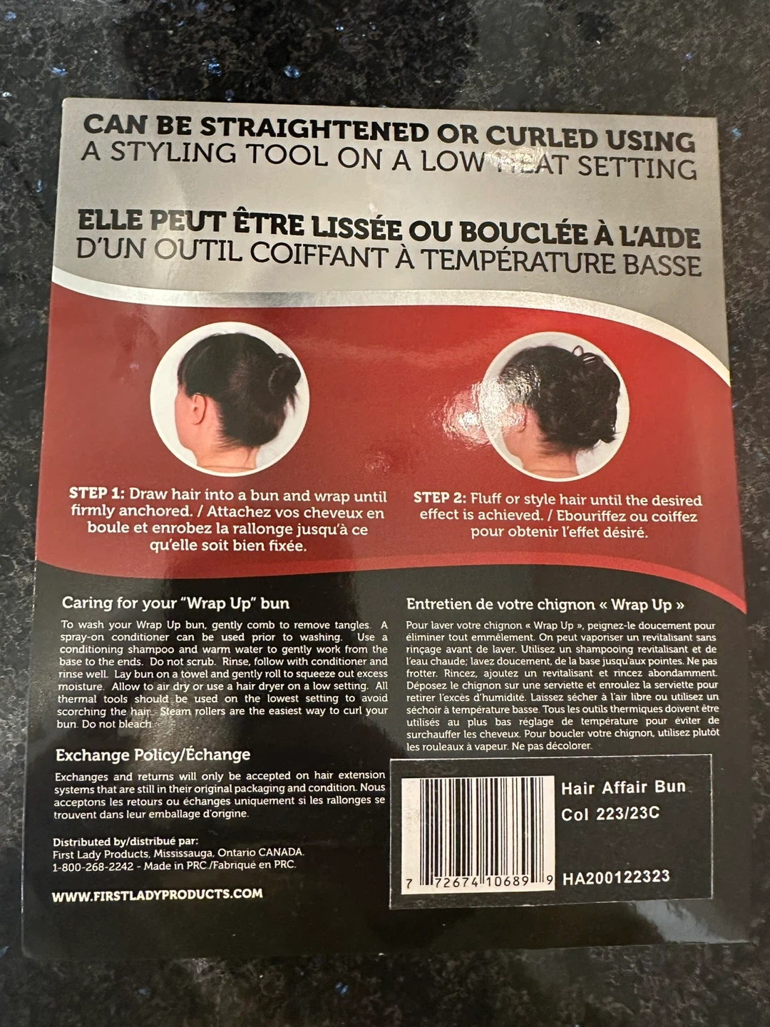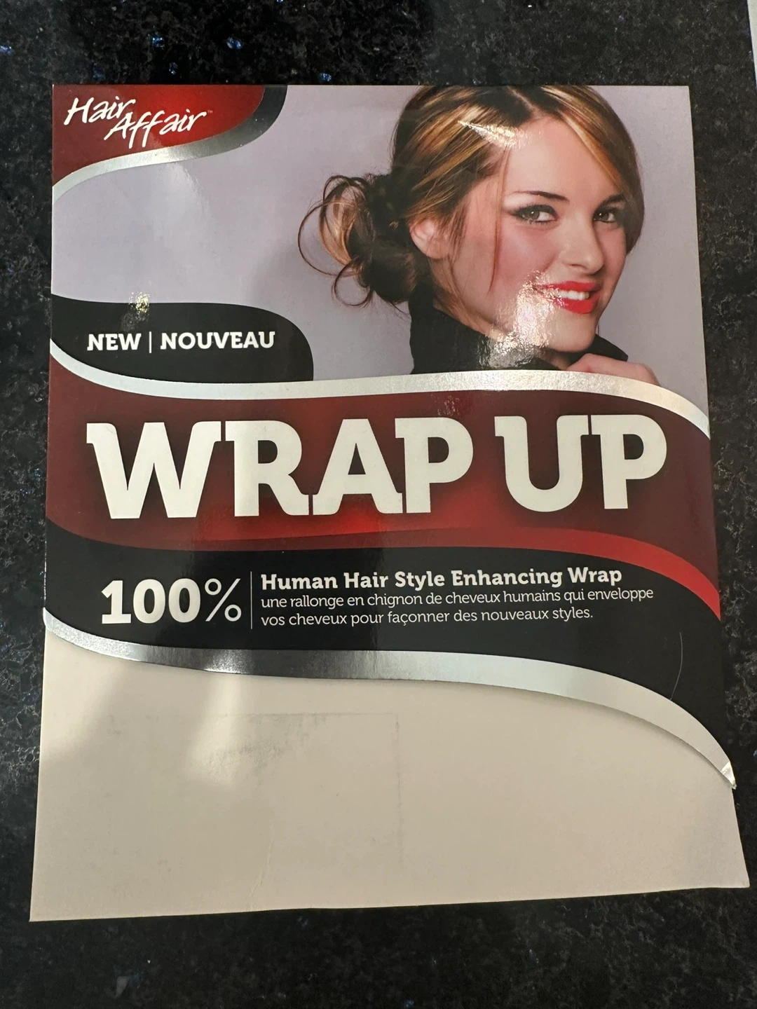 Selling a Hair Affair Wrap Up hair bun. It can be straightened or curled using a styling tool on a low heat setting. Hair can be dyed to match your hair color. It's a human hair style enhancing wrap. The box is included!