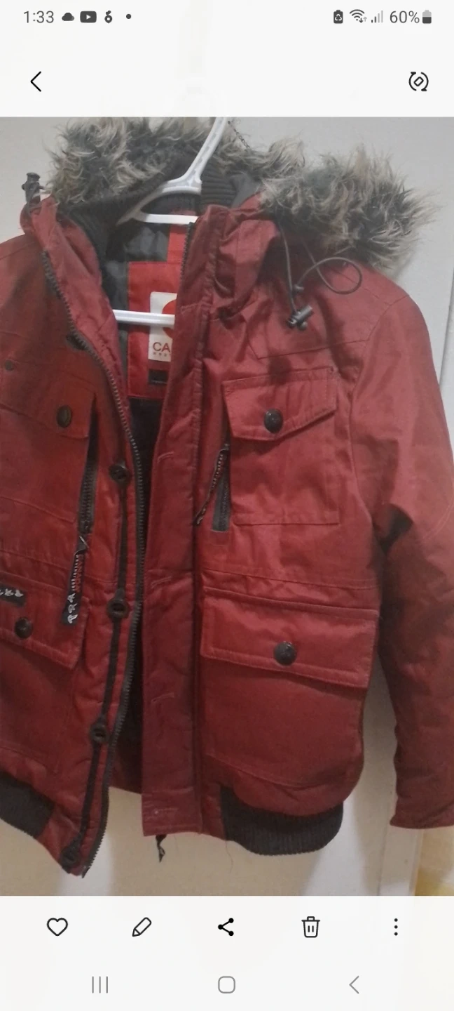 Here's a red Canada Weather Gear jacket with a fur-trimmed hood. It has a few pockets on the front and is in good condition!