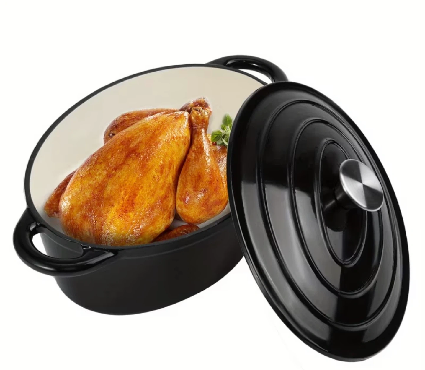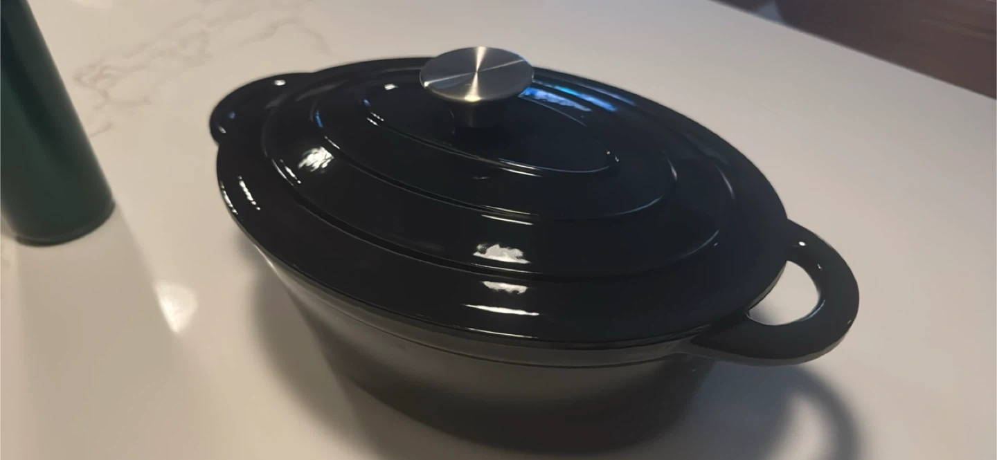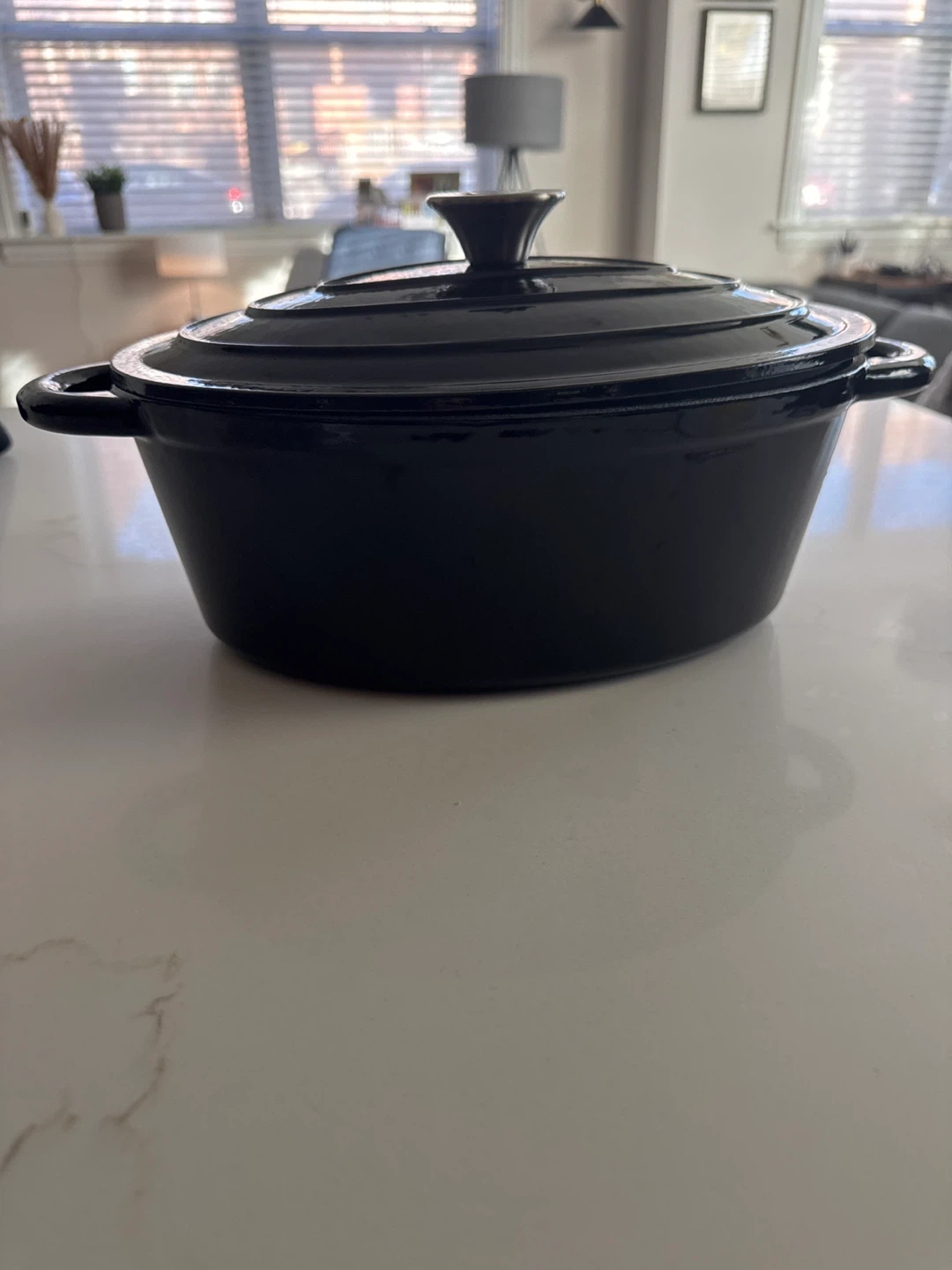 I'm selling a black enameled cast iron Dutch oven. It's perfect for cooking up delicious meals! It's a great addition to any kitchen, offering even heating and lasting durability. It’s 4.5 quarts.