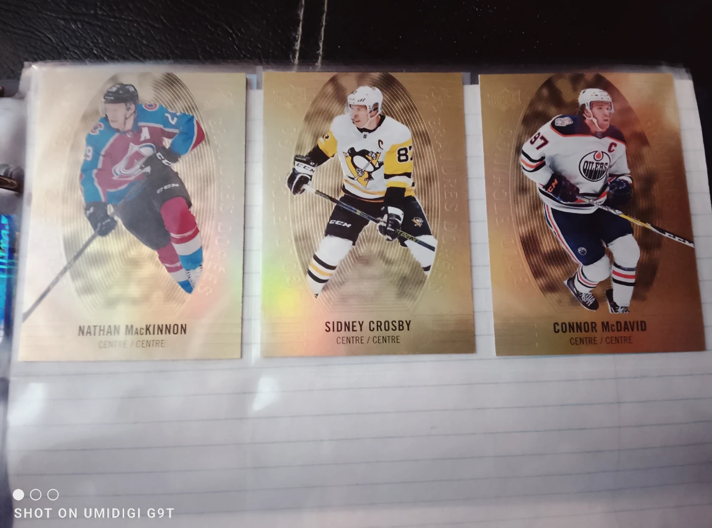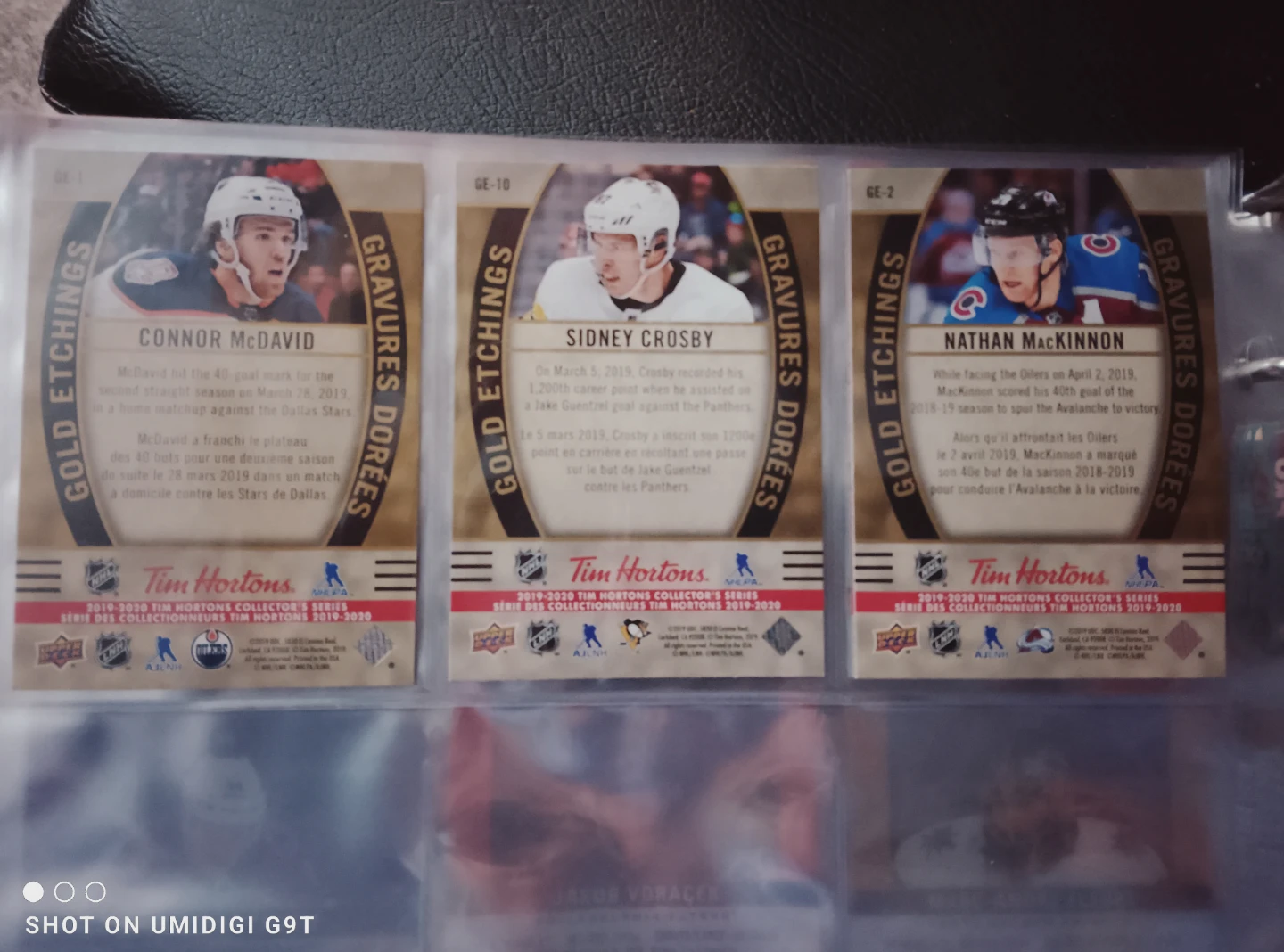 Selling a set of Tim Hortons hockey cards featuring Nathan MacKinnon, Sidney Crosby, and Connor McDavid. These cards are from the 2019-2020 Collector's Series Gold Etchings.