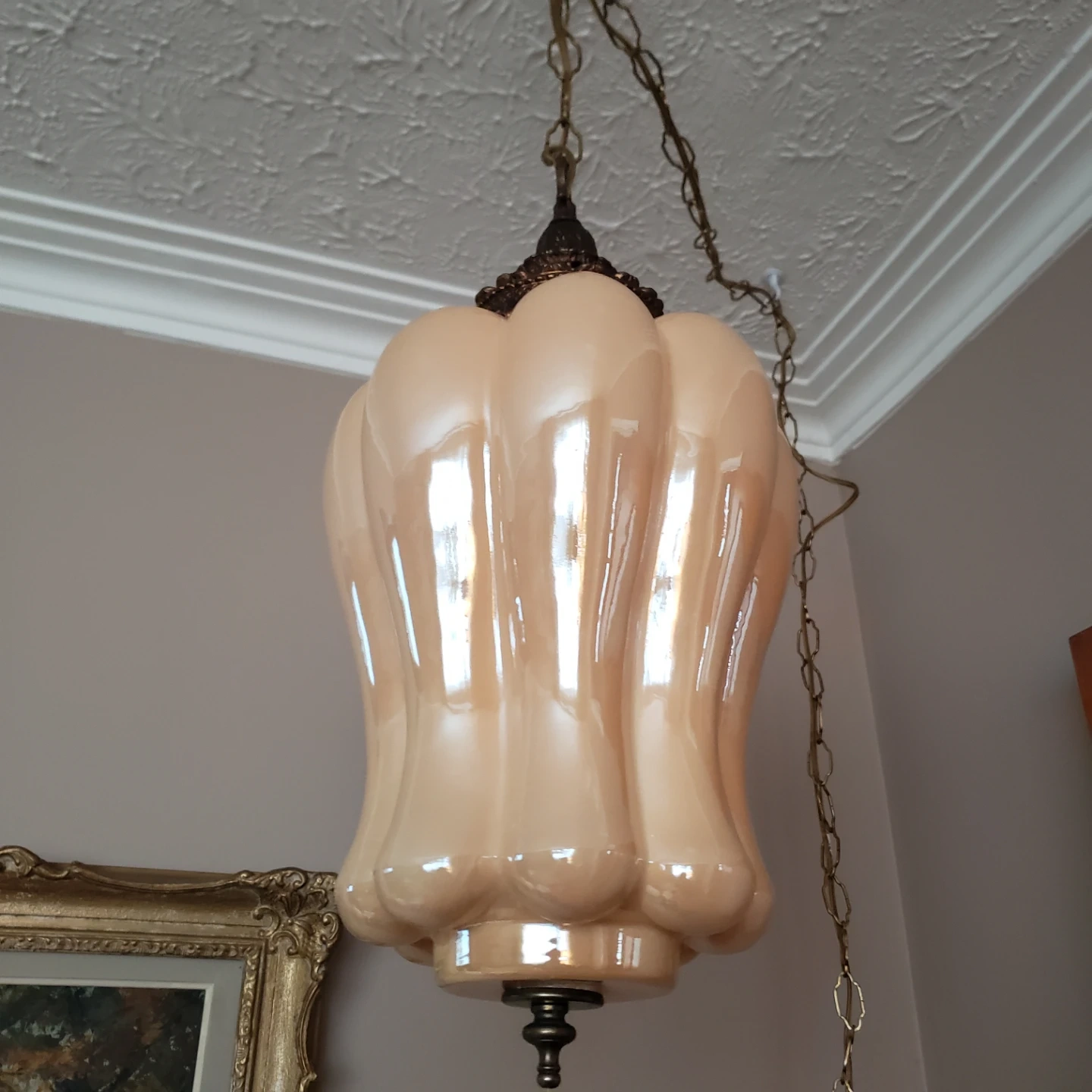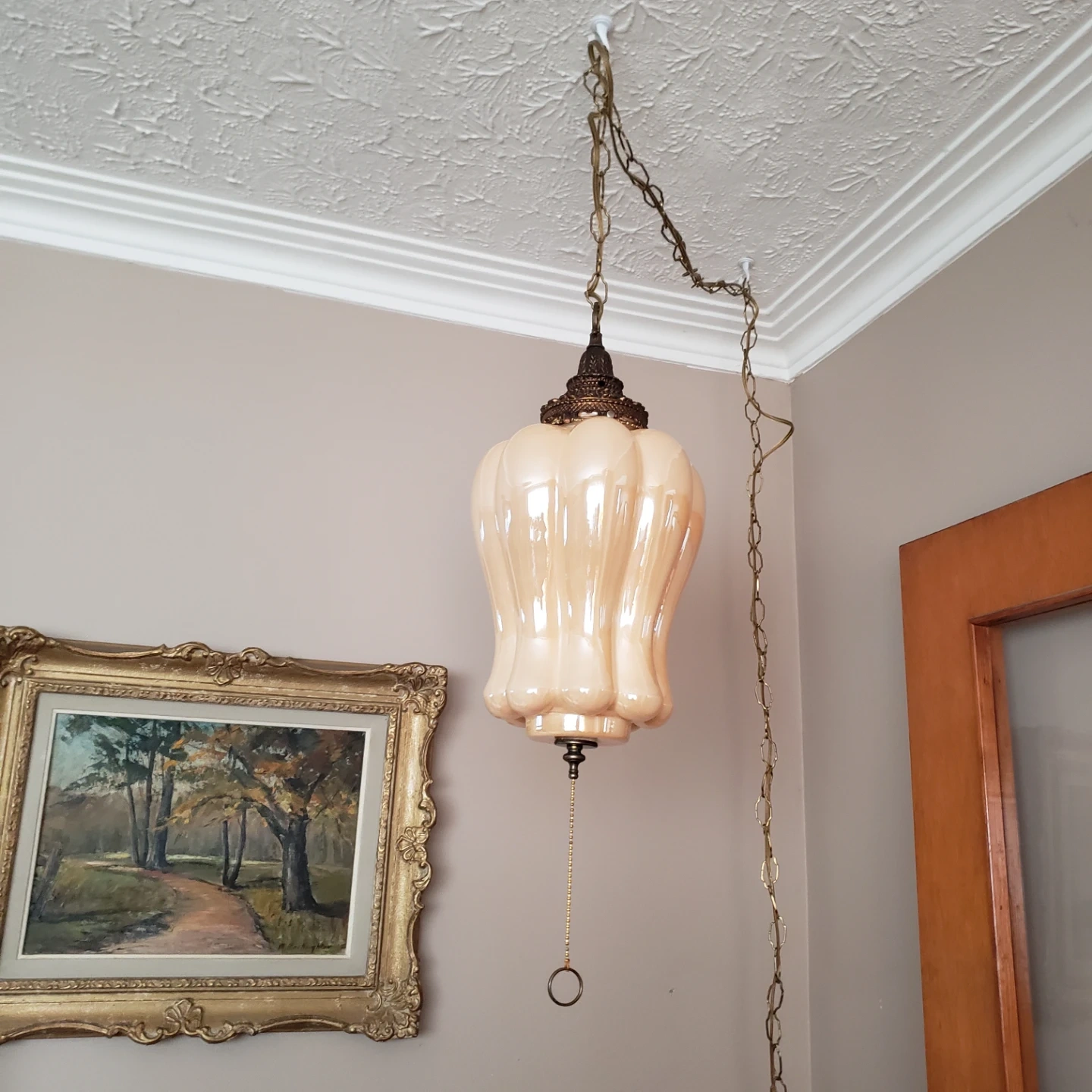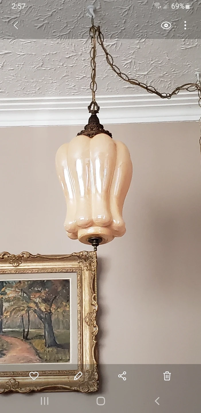 Here's a vintage hanging swag lamp with a unique design! It's in good condition and would be a great addition to any room. The lamp features a chain for hanging and a pull chain for easy on/off It plugs into wall outlet .