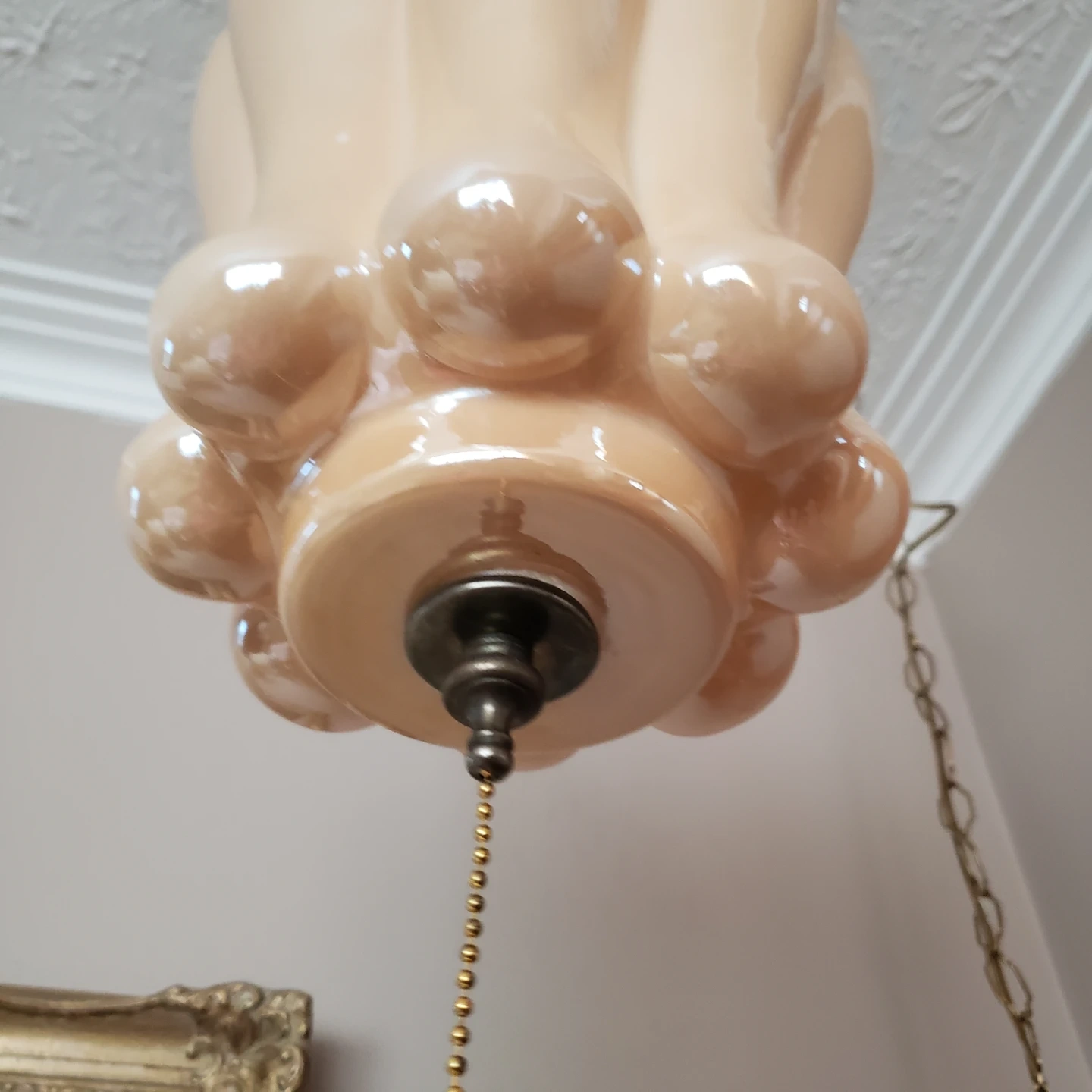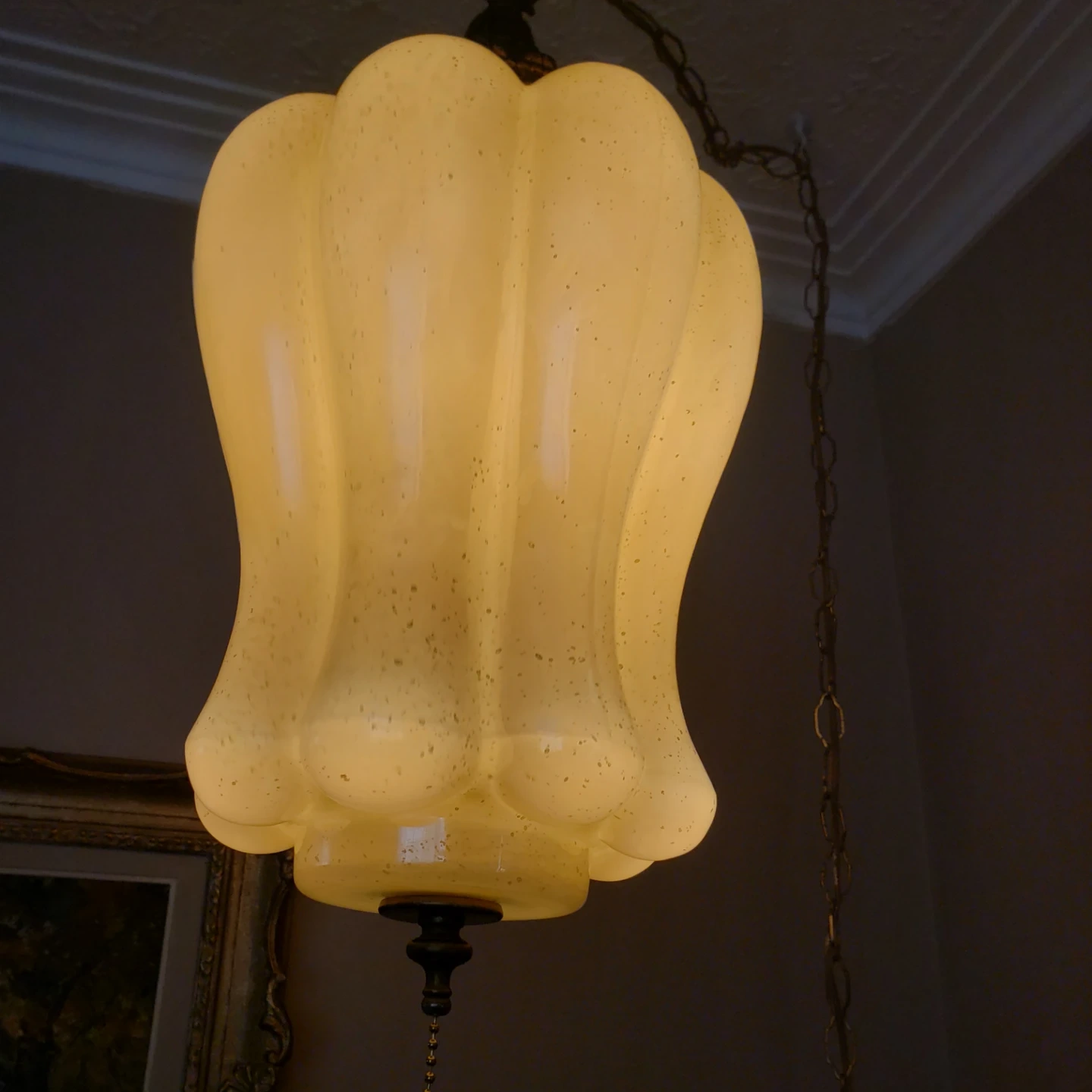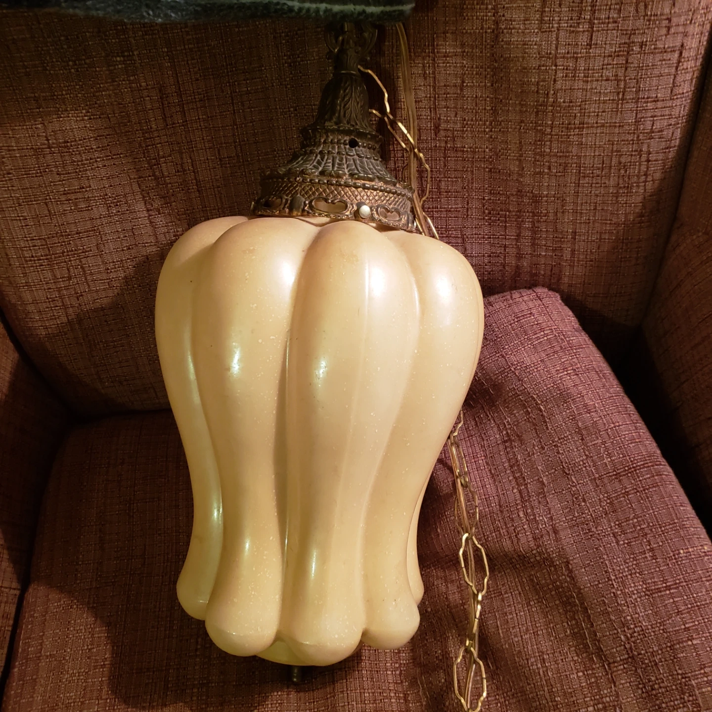 Here's a vintage hanging swag lamp with a unique design! It's in good condition and would be a great addition to any room. The lamp features a chain for hanging and a pull chain for easy on/off It plugs into wall outlet .