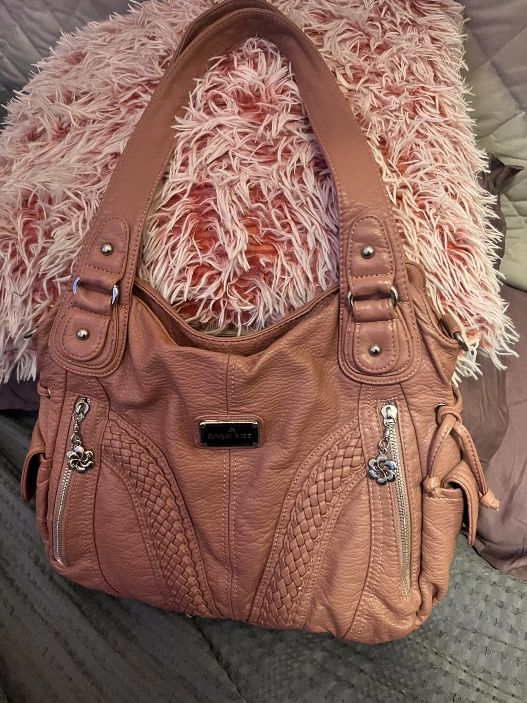Selling a lovely Angel Kiss shoulder bag! It's in great condition and features a stylish design with braided accents and cute flower zipper pulls. Perfect for everyday use! I also have many other purses that come with dust bags. Just ask me about them, and I can send you pictures. Was only used maybe 3 times. OBO. The other purses are brand new, never been used.