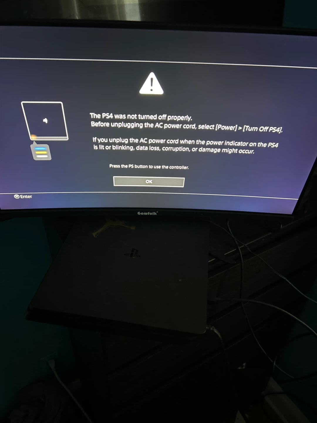 Selling a used PlayStation 4. Please note the PS4 was not turned off properly in the image. Before unplugging the AC power cord, select [Power] > [Turn Off PS4]. If you unplug the AC power cord when the power indicator on the PS4 is lit or blinking, data loss, corruption, or damage might occur