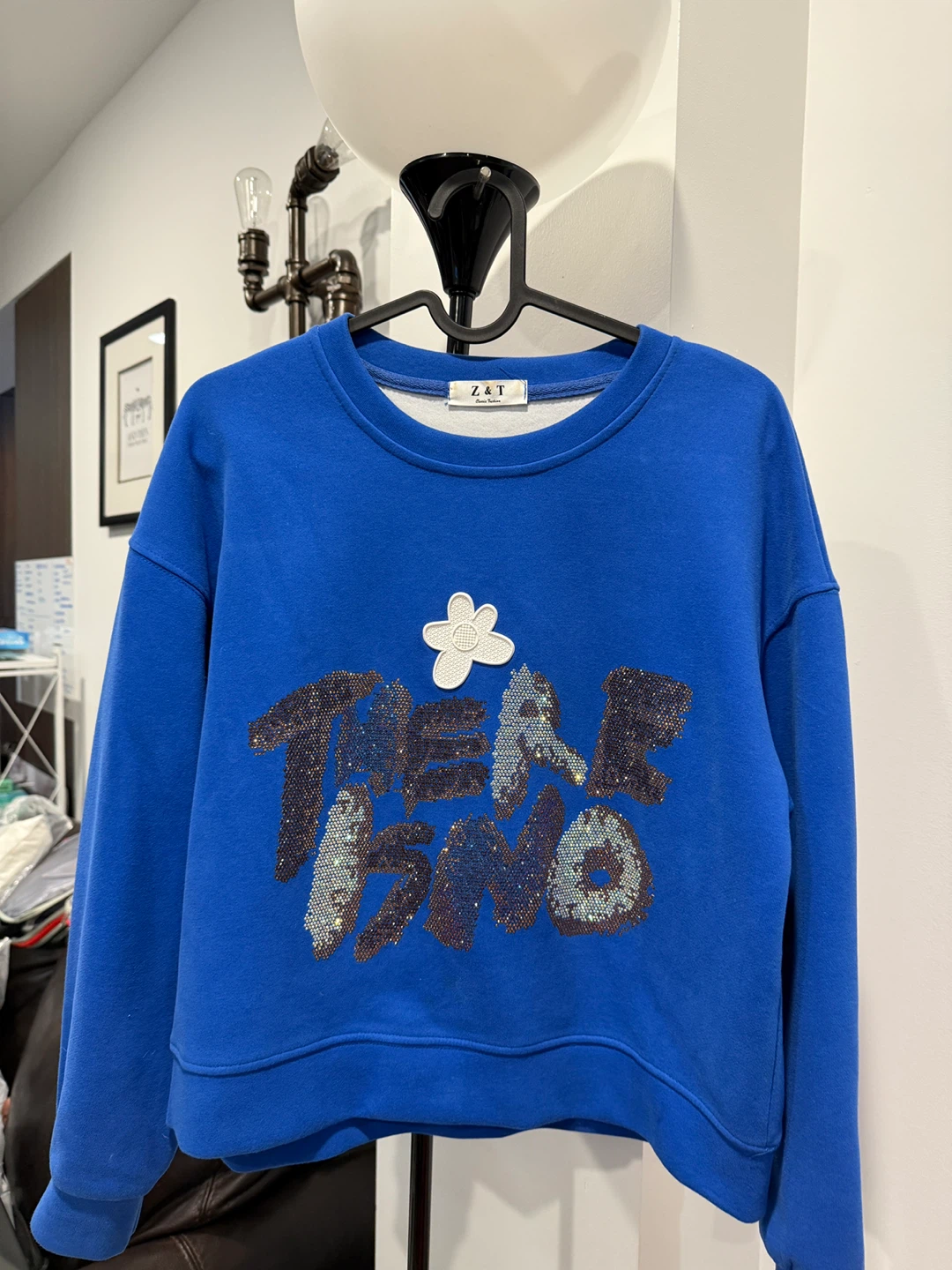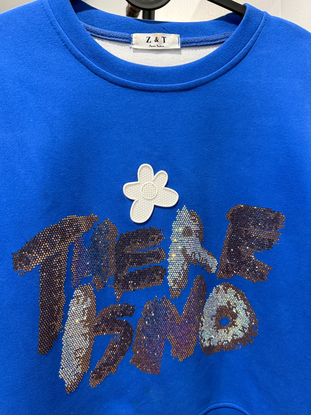 Here's a blue sweatshirt from Z&T! It features a cute flower and the words "THE REAL THING" in sparkly lettering. Perfect for adding a pop of colour to your wardrobe