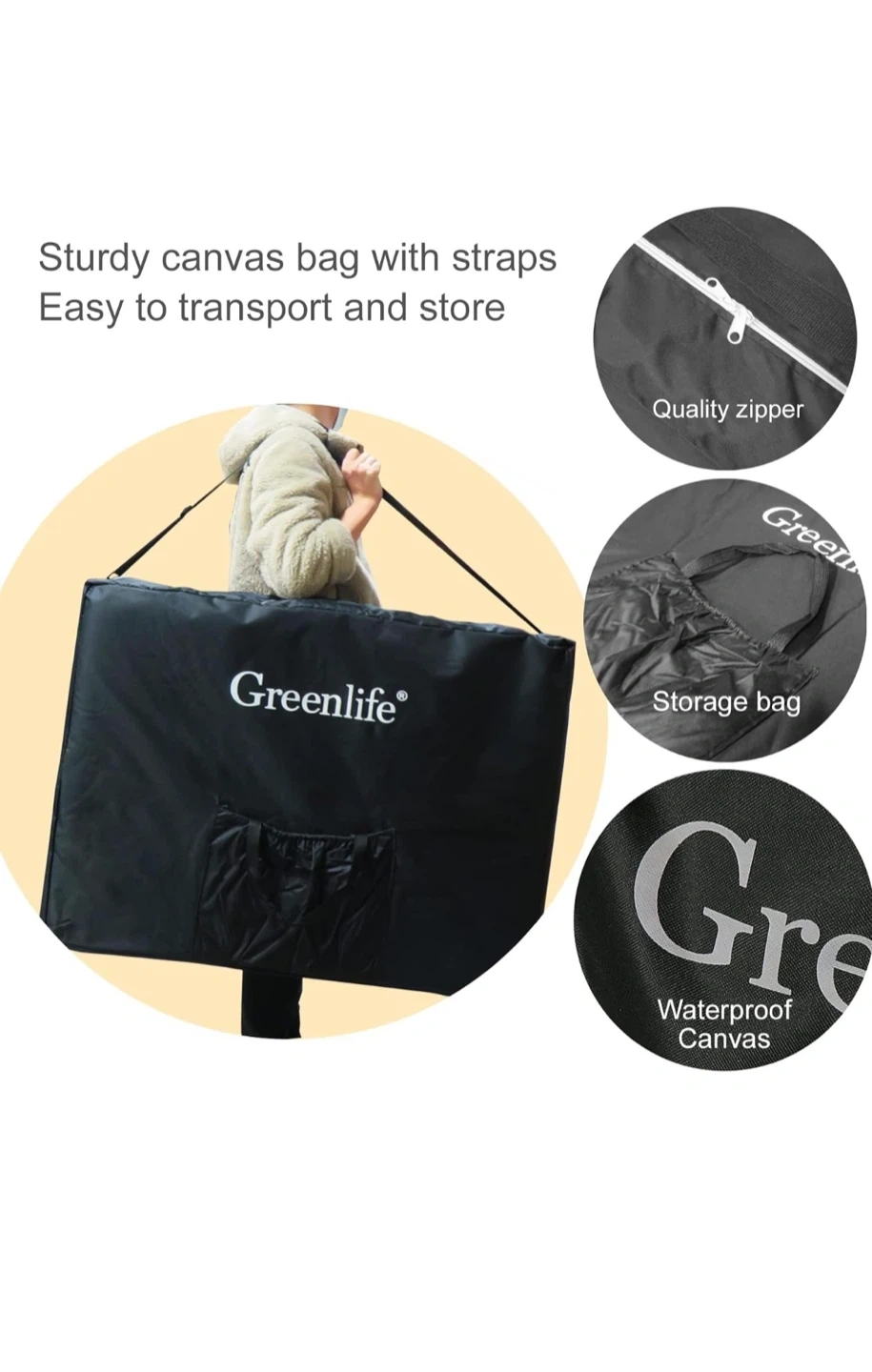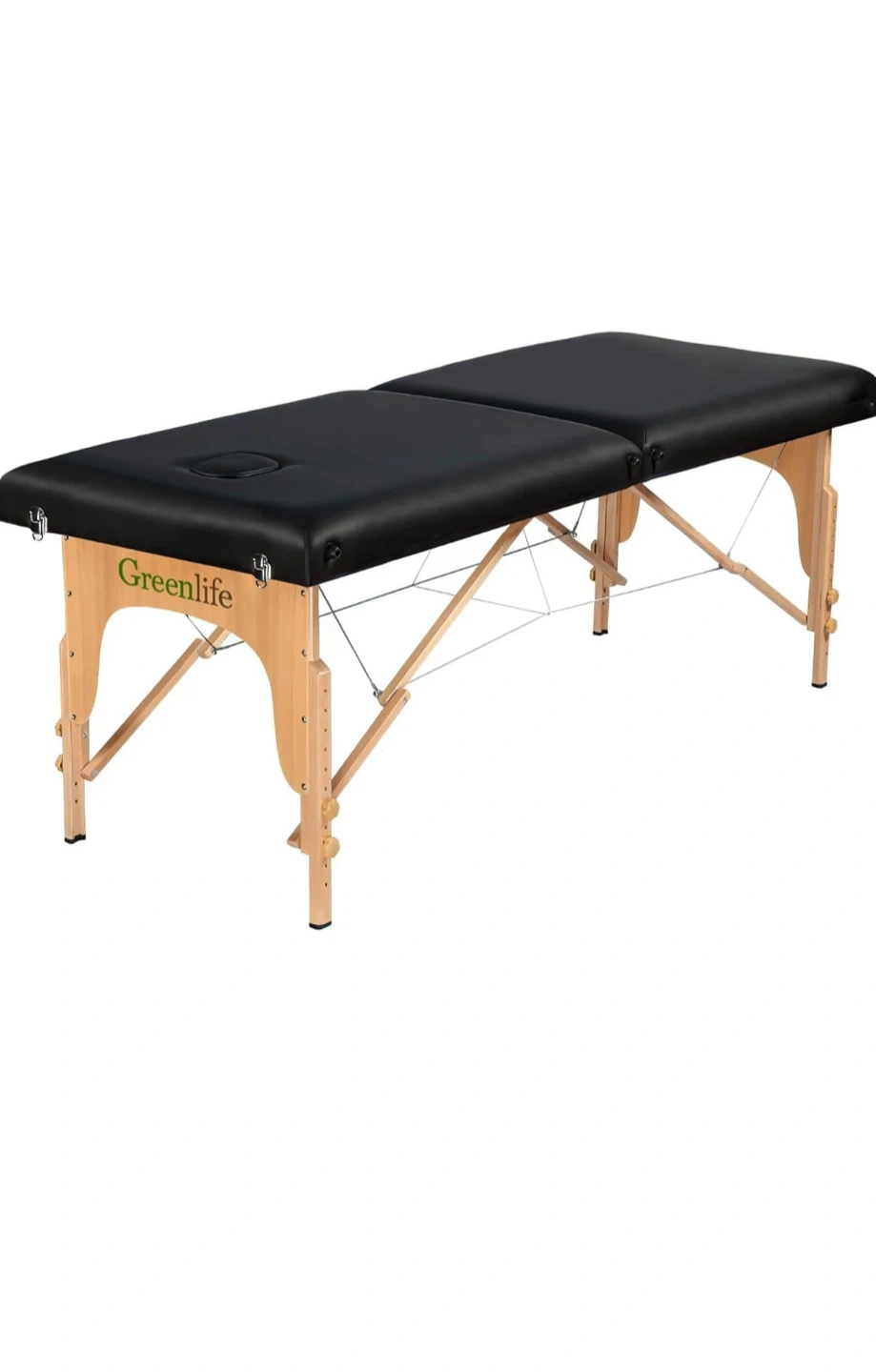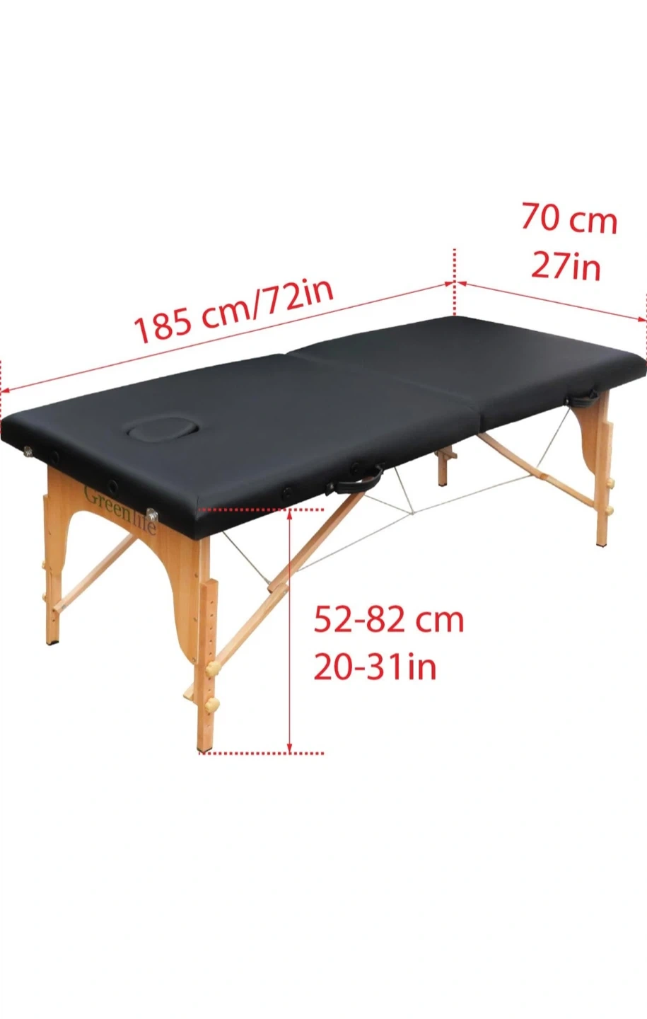 Selling a Greenlife portable massage table. It comes with a sturdy canvas bag with straps, making it easy to transport and store. The bag has a quality zipper and is waterproof. The table is 185 cm/72 inches long, 70 cm/27 inches wide, and the height is adjustable from 52-82 cm/20-31 inches.