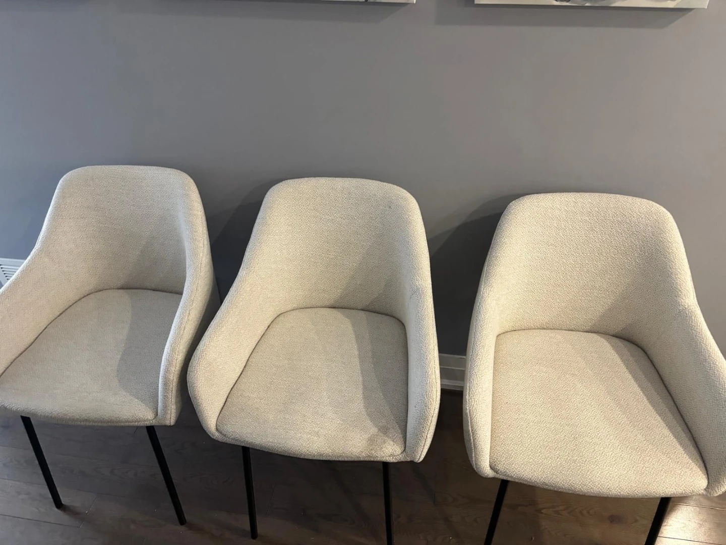 Selling a set of three dining chairs. They feature a neutral beige fabric and black legs. Perfect for adding a touch of modern style to your dining space!
