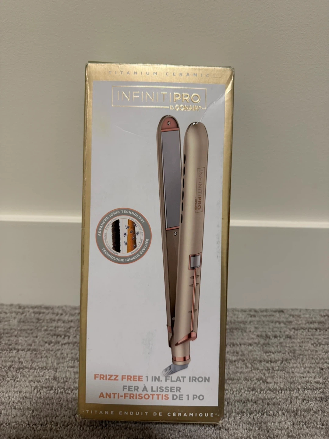 Selling a brand new InfinitiPro by Conair flat iron! It's a 1-inch flat iron designed to be frizz-free. It also features titanium ceramic plates and advanced ionic technology. Comes with the original box!