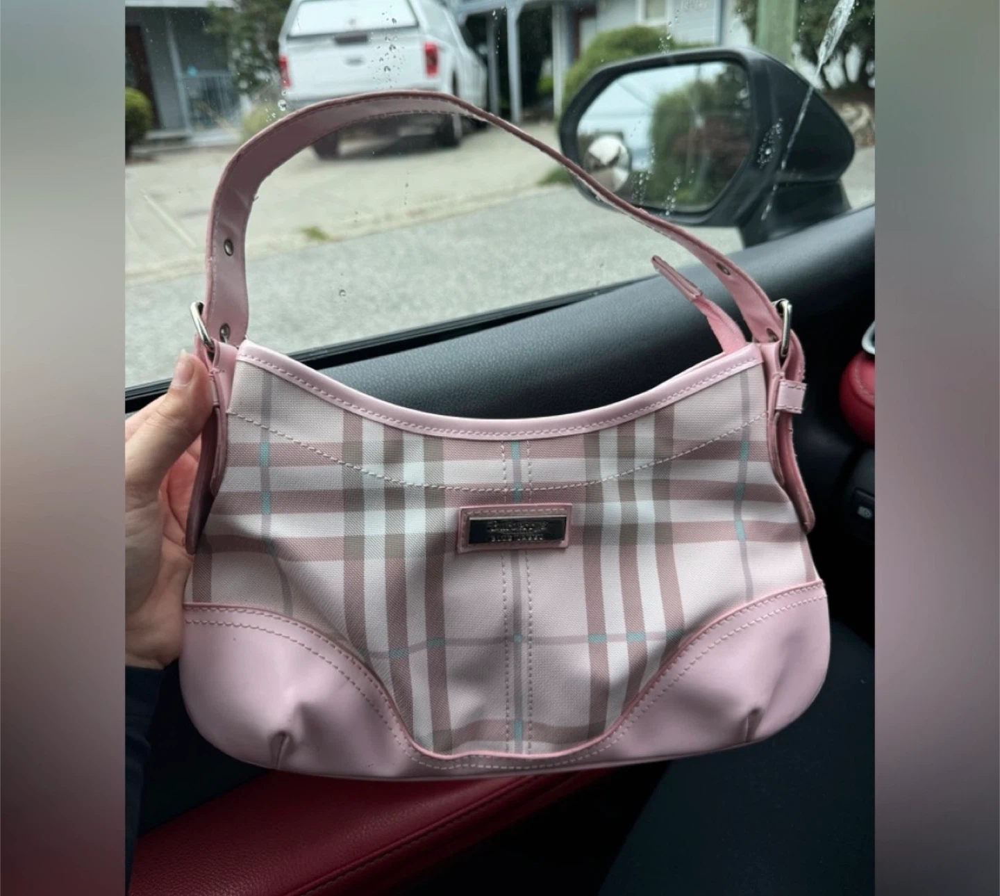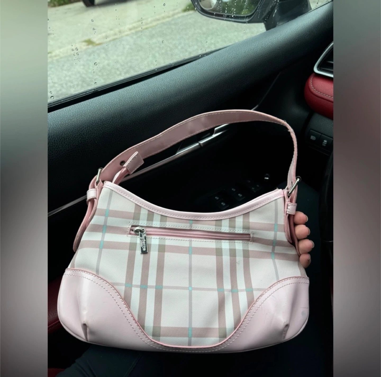 Selling a cute pink shoulder bag! It features a plaid design in shades of pink and white. It's in great condition and perfect for adding a touch of style to any outfit