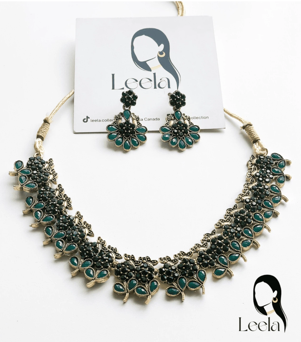 Beautiful Leela necklace and earring set, perfect for adding a touch of elegance to any outfit! The set features a lovely combination of green and black stones in a floral design. It's in great condition and ready to be enjoyed!