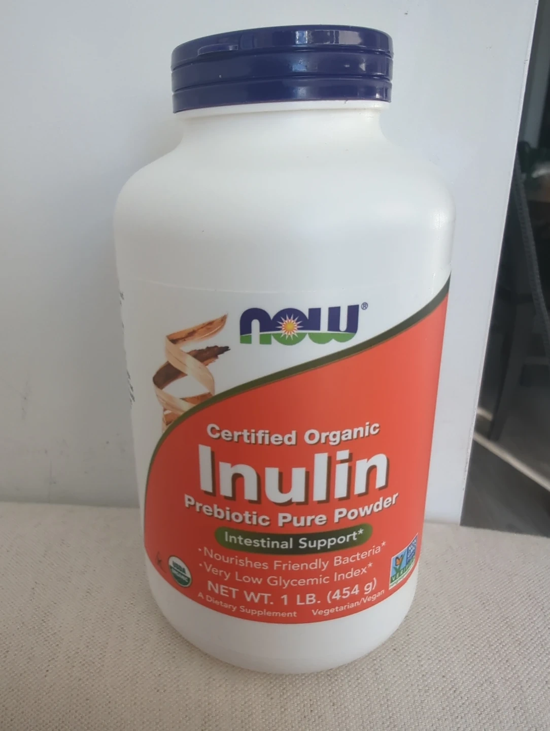 Selling a bottle of NOW Certified Organic Inulin Prebiotic Pure Powder! It's an intestinal support supplement that's vegetarian and vegan friendly. It nourishes friendly bacteria and has a very low glycemic index. The best before date is September 2027