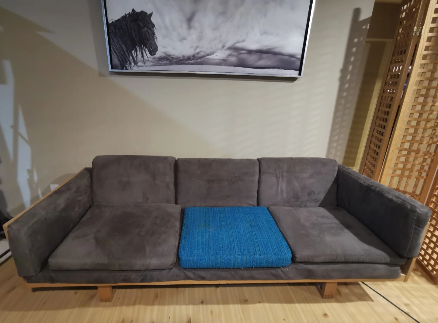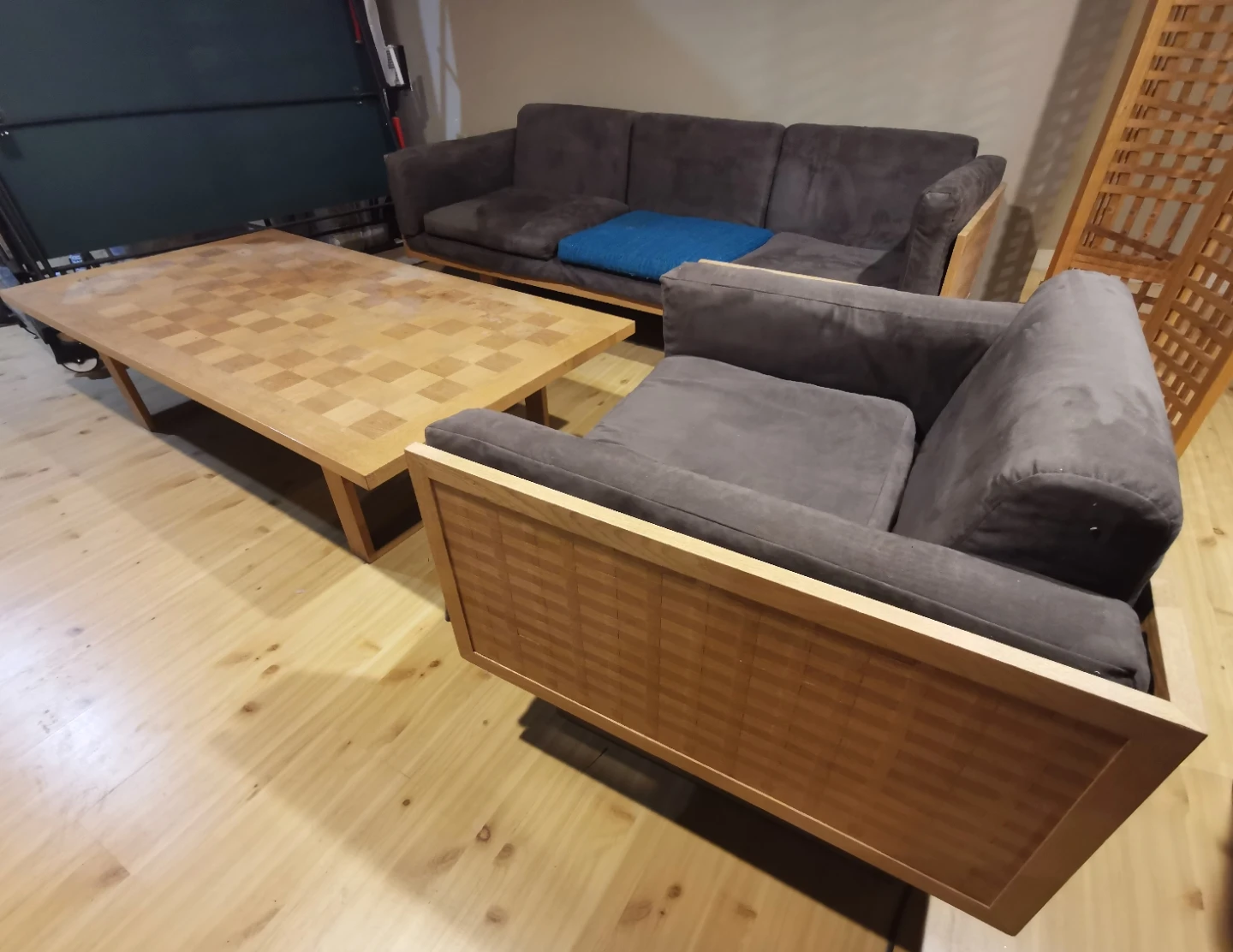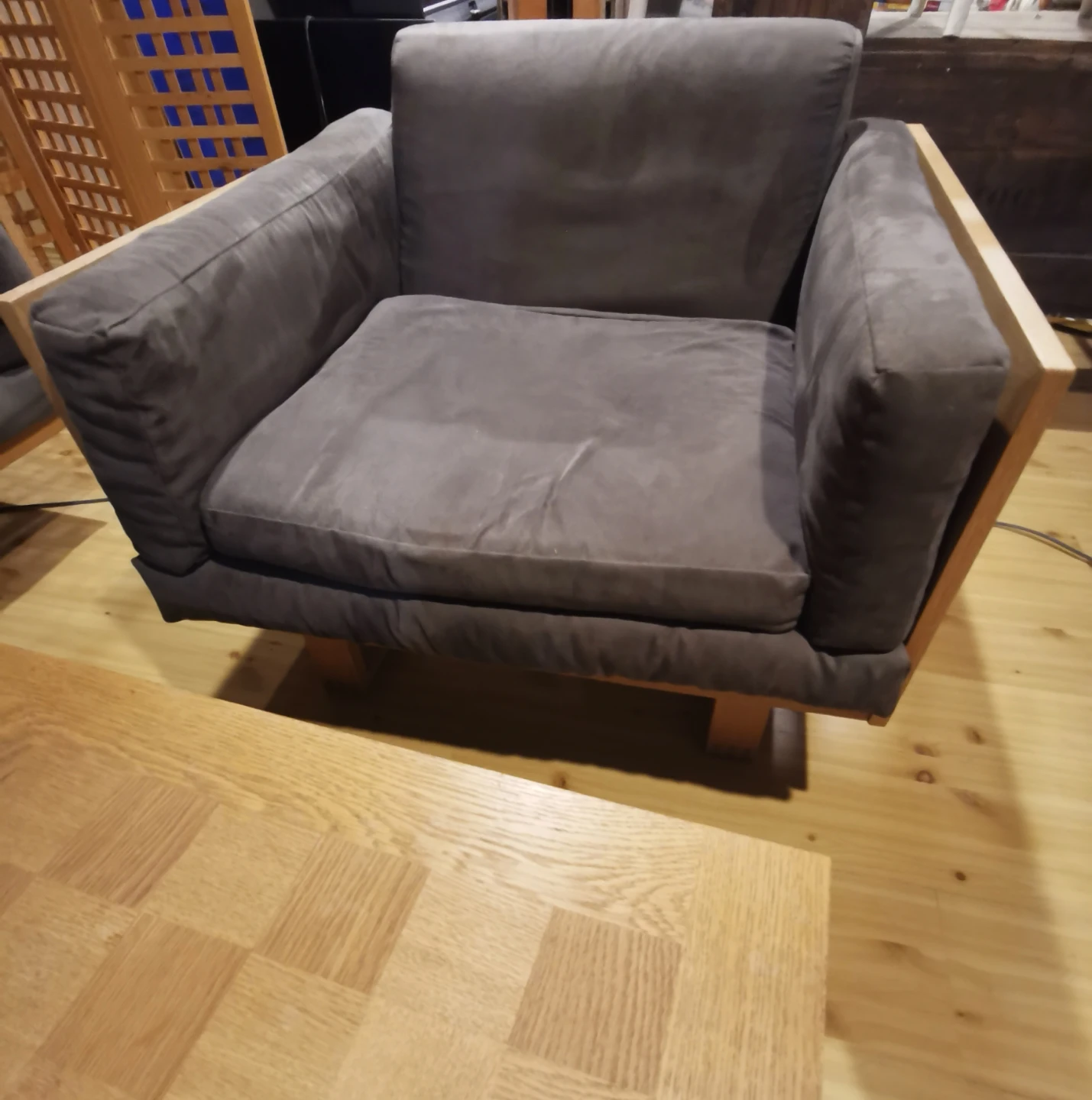 Cushions are from wool bouclair in blue, they are covered with grey covers that can be easily removed and replaced, please see the pictures with all the stamps and details. The set is in great pre-owned condition, the price is for all the set (I am asking for whole set less than what you would pay for just a single chair, these pieces are almost impossible to find these days)