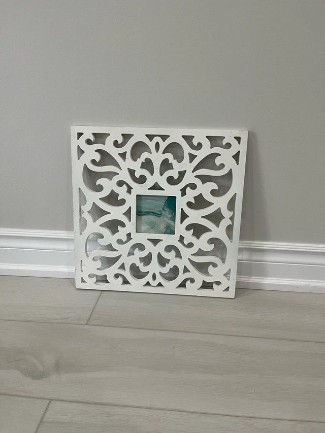 White frame (some scruff marks). Could be painted. Insert a picture of your liking. Size: 16 x 16 inches. St. Catharines