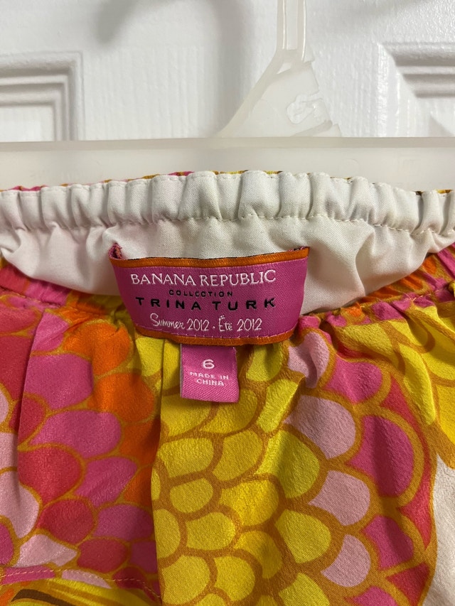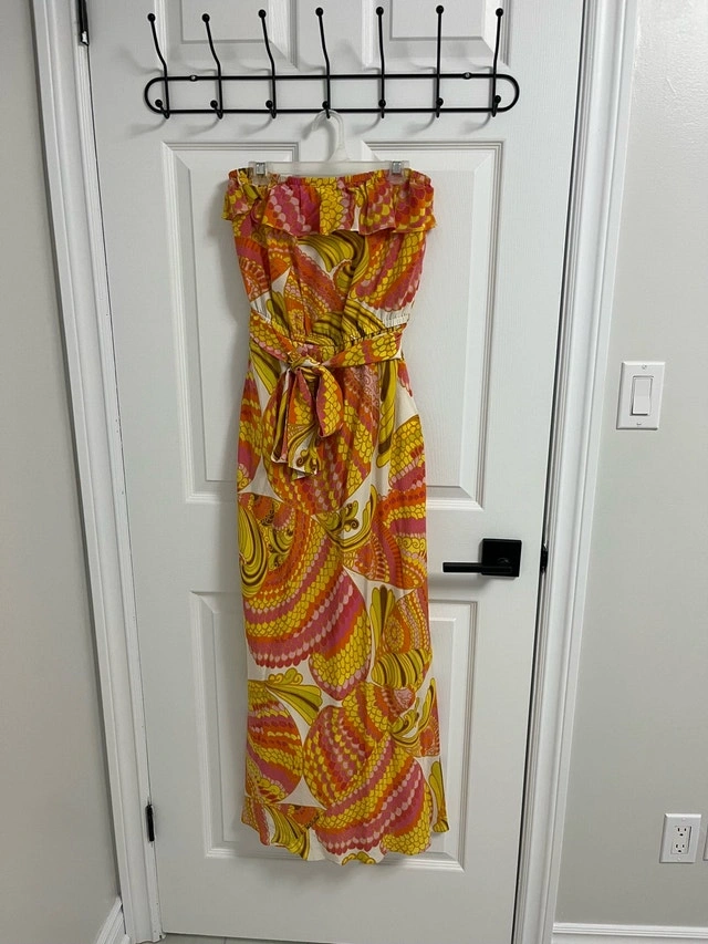 Vibrant strapless Maxi Dress with a bold retro-inspired print. Flattering tie waist (removable) and ruffle neckline detail. Perfect for summer, beach vacations, or casual outings. Lightweight & comfortable! Size 6 St. Catharines