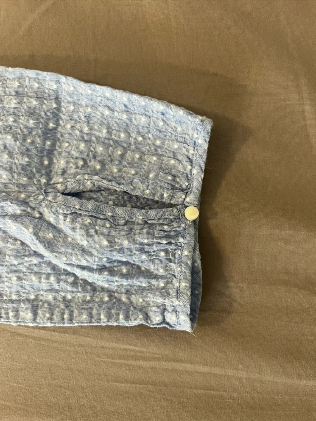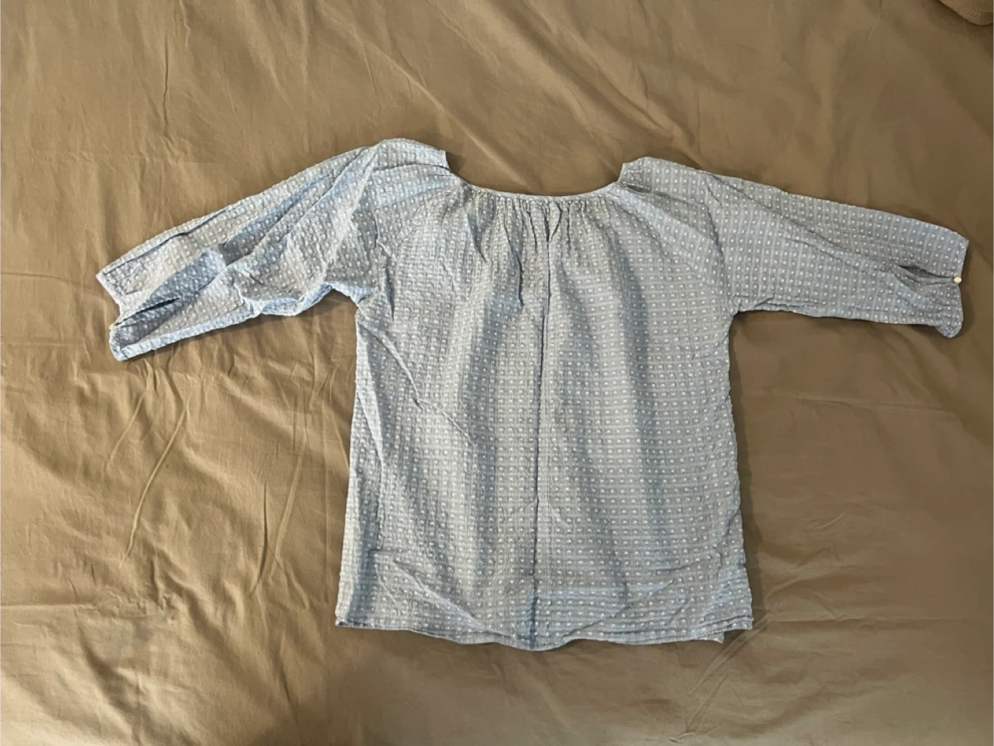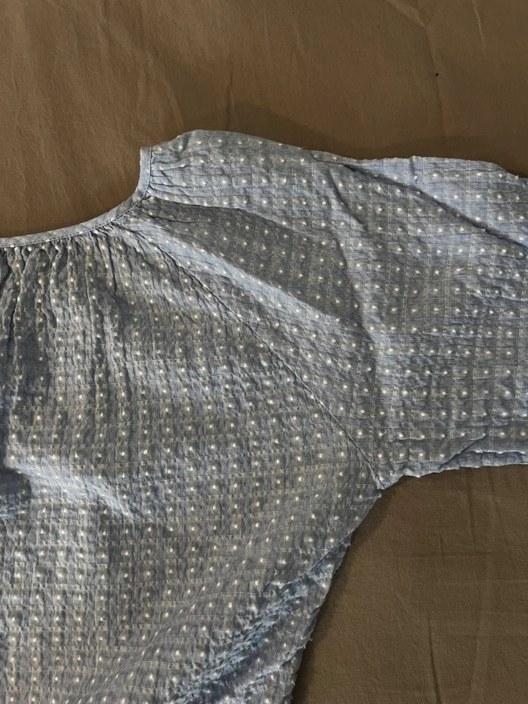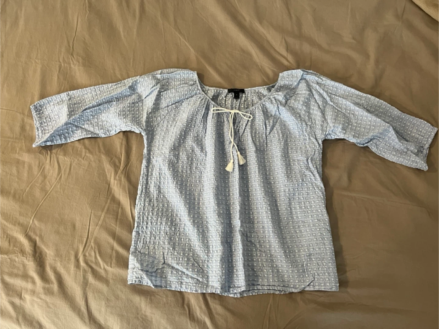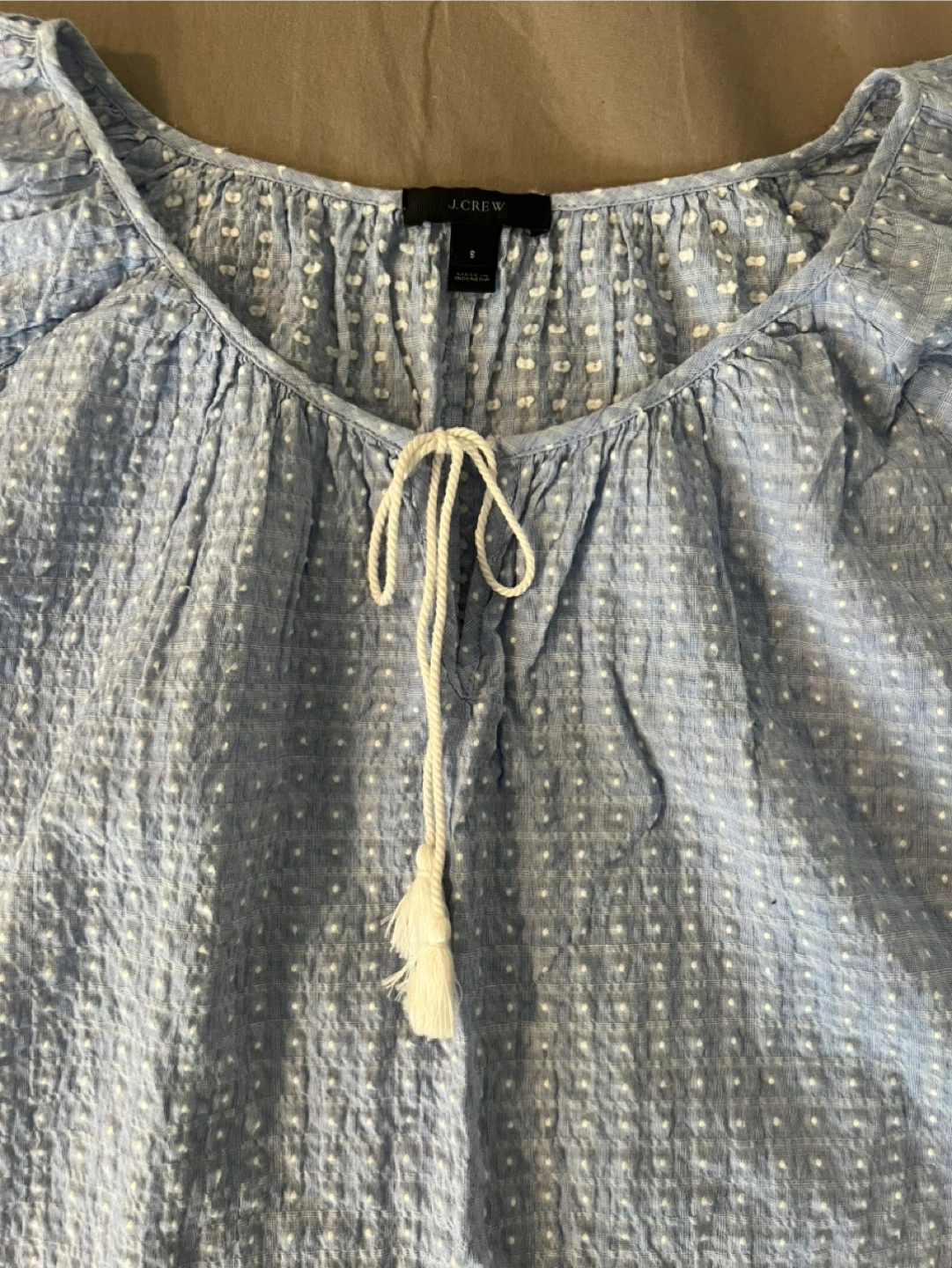 Light blue summery J.Crew blouse with white textured dot pattern and a tie detail at the neckline. Says size S but would fit a M.