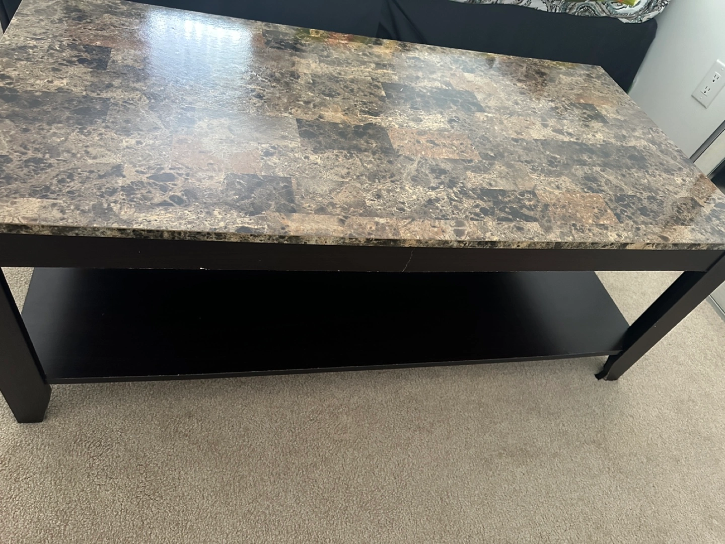 Selling a coffee table with a faux marble top and a sleek black frame. It has a lower shelf for extra storage or decor!