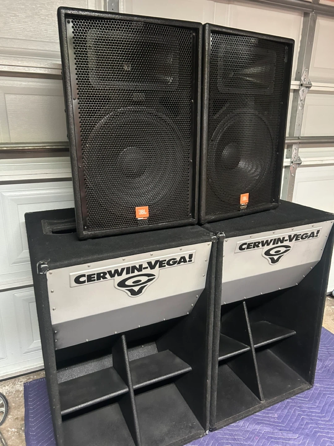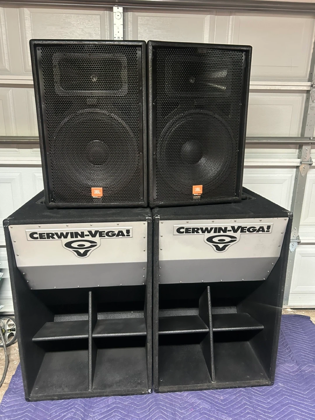 Selling a set of JBL speakers along with Cerwin-Vega subwoofers. They're perfect for anyone looking to upgrade their sound system!