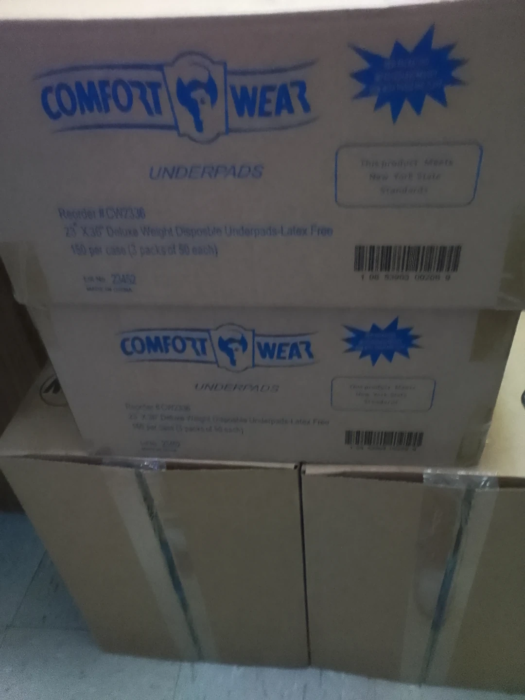 Selling a case of Comfort Wear Underpads. These are deluxe weight disposable underpads and are latex-free. Each case contains 150 underpads, with 3 packs of 50 each. They are 23" x 36" in size ASKING 25.00 THE BOX