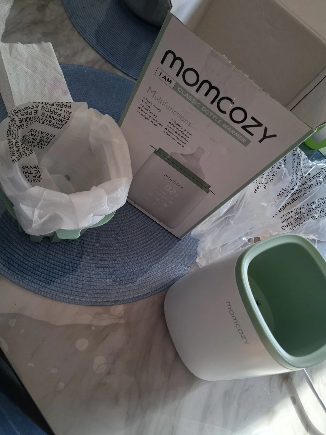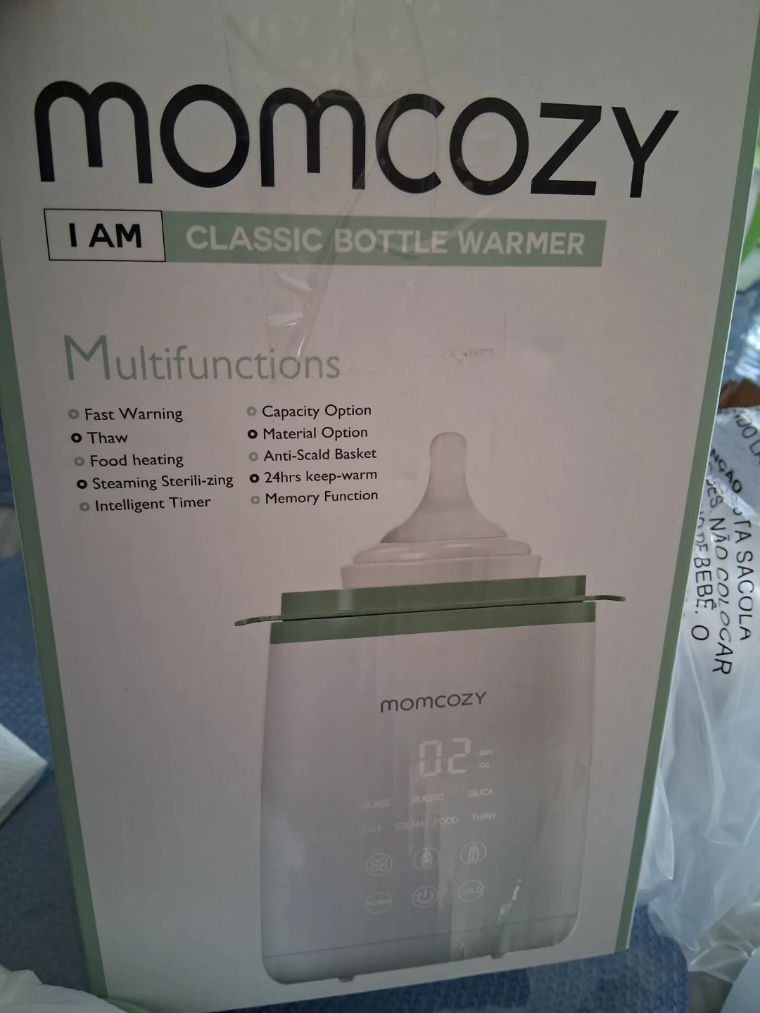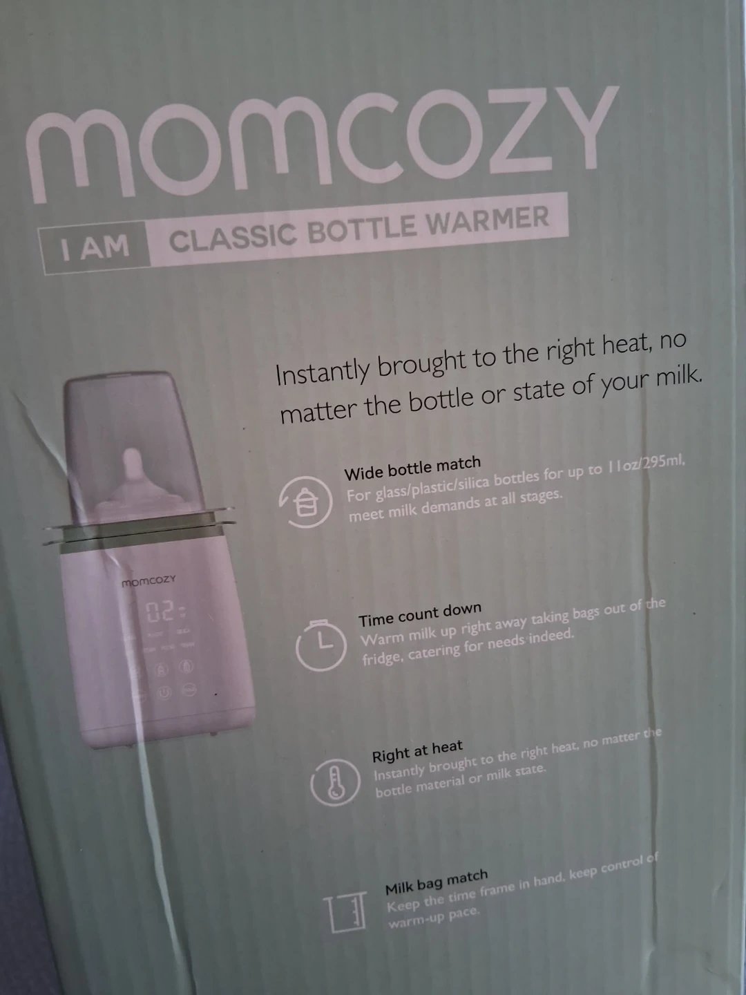 Selling a Momcozy I AM Classic Bottle Warmer. It instantly brings milk to the right temperature, no matter the bottle or milk state. It is compatible with glass or plastic bottles up to 11oz/295ml. It also has a time countdown to warm milk quickly. It can also be used for milk bags. It has multiple functions like fast warming, thawing, food heating, and steaming sterilizing. It also has an intelligent timer, capacity option, material option, anti-scald basket, 24 hour keep-warm and memory function. Comes with the box!