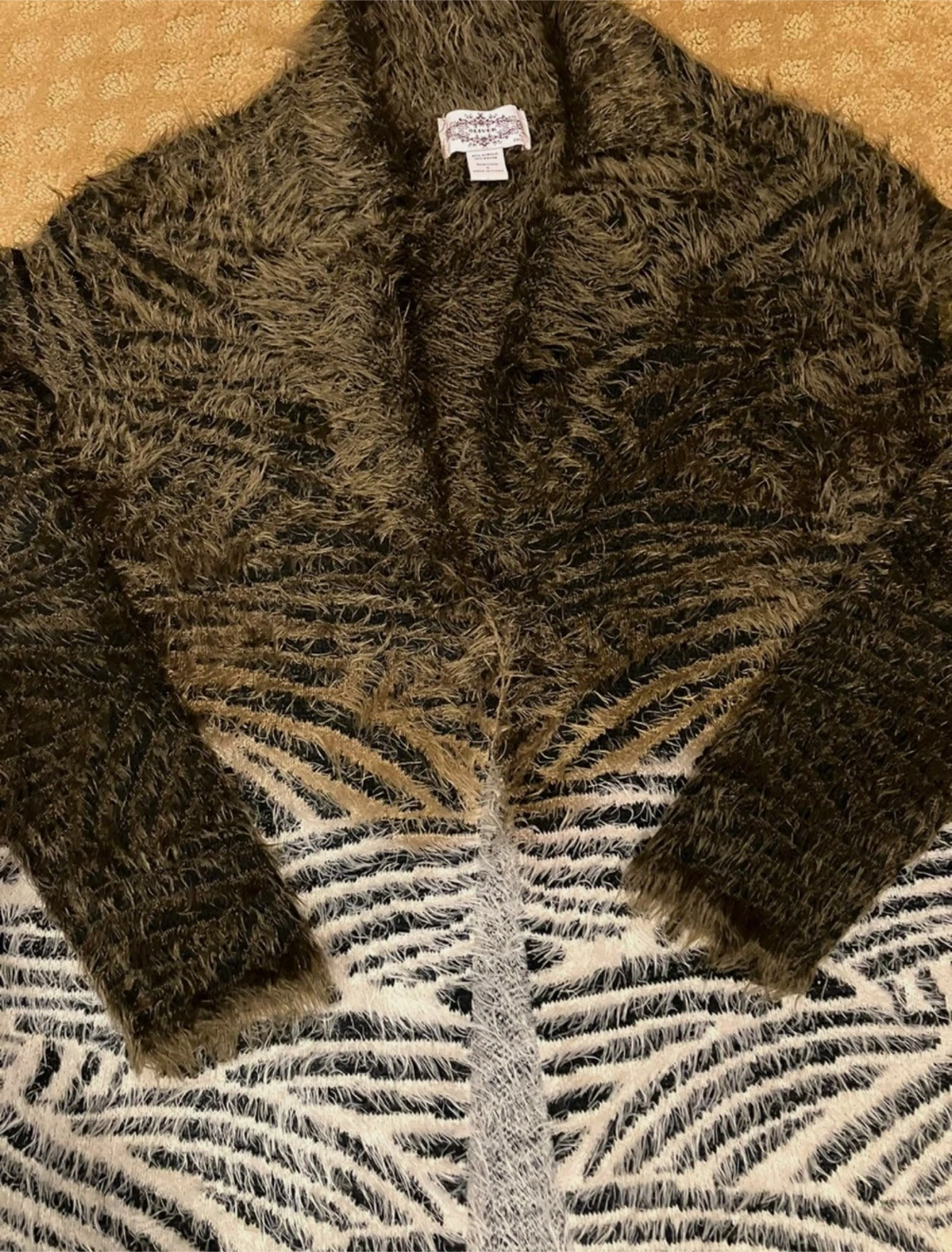 Selling a unique Oliver by Escio cardigan! It's a size small and made of 80% acrylic and 20% rayon. The cardigan features a fuzzy texture in brown with a black and white patterned bottom. It's in great condition and ready for a new owner!