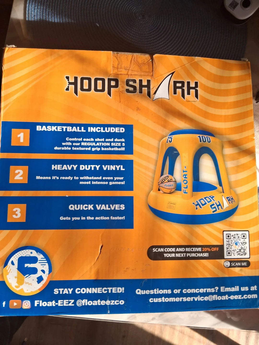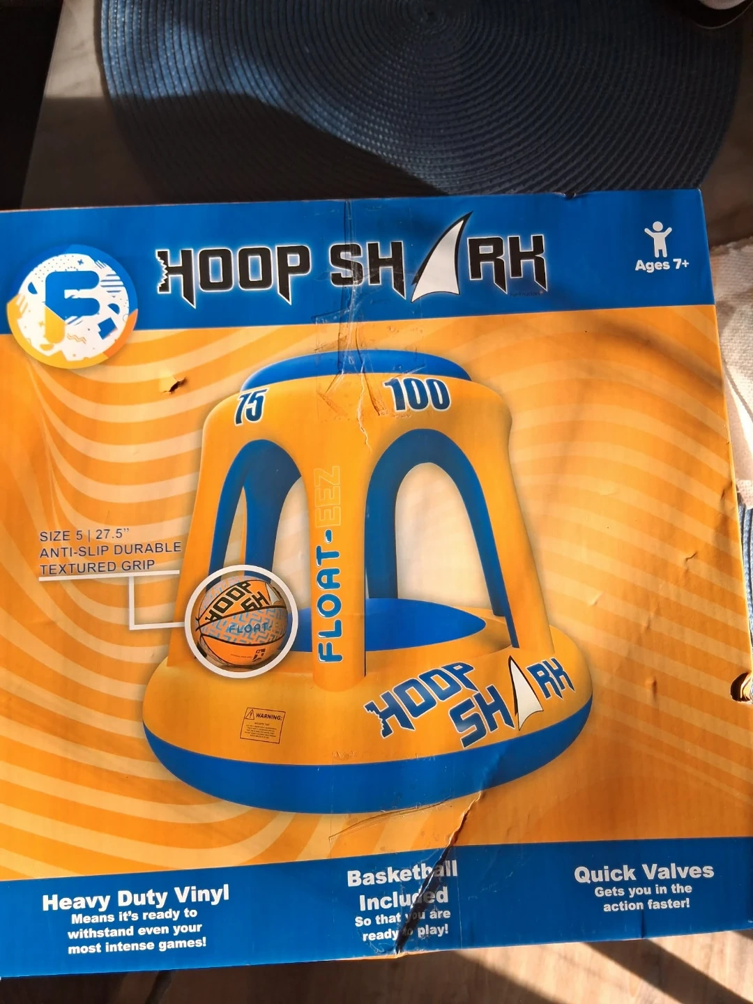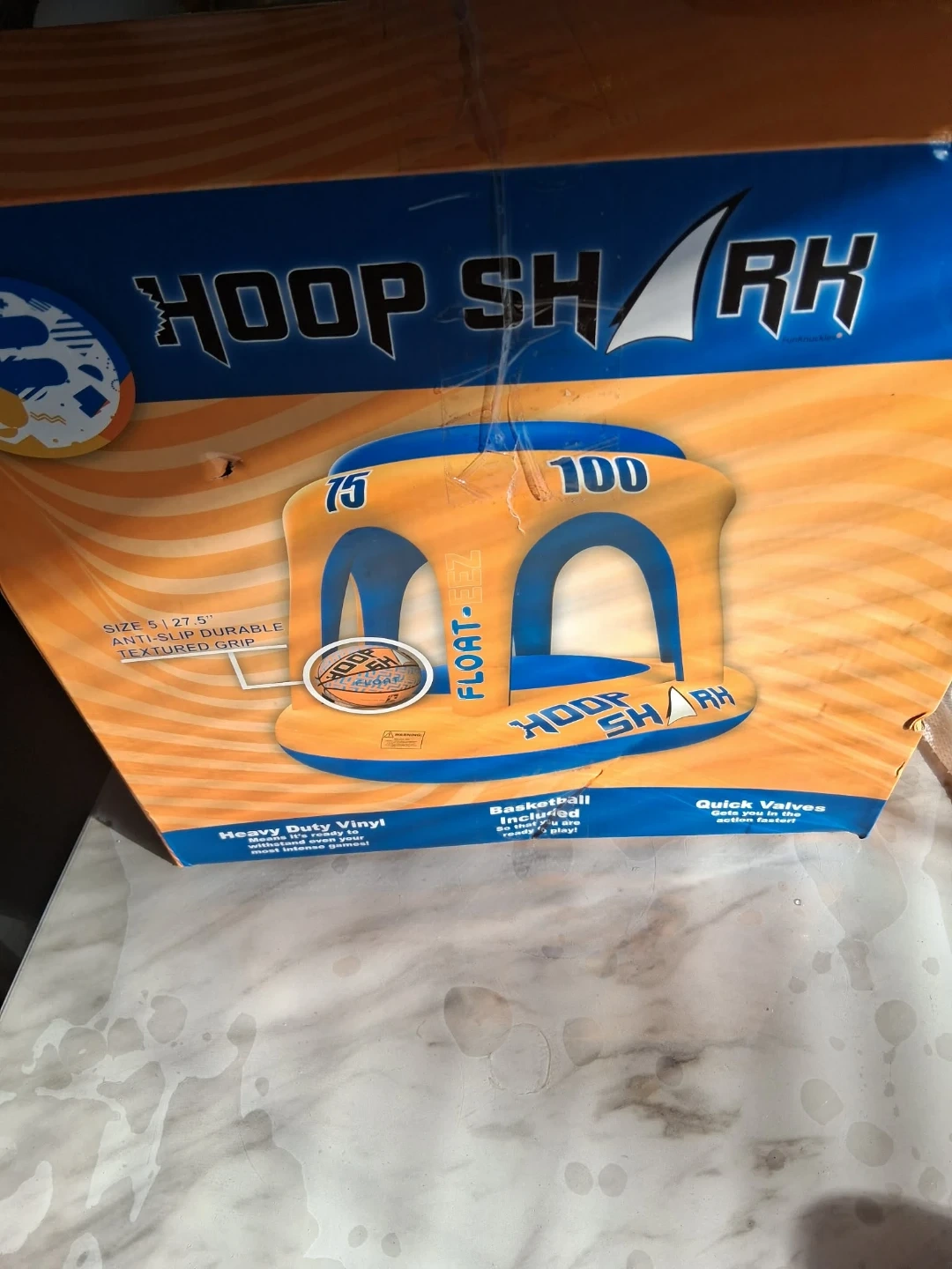 Get ready for some fun in the sun with this Hoop Shark Float-Eez! It's perfect for pool basketball games with friends and family. The set includes a basketball, so you're ready to play right away. The float is made of heavy-duty vinyl and has an anti-slip durable textured grip. It also features quick valves to get you in the action faster! Box included