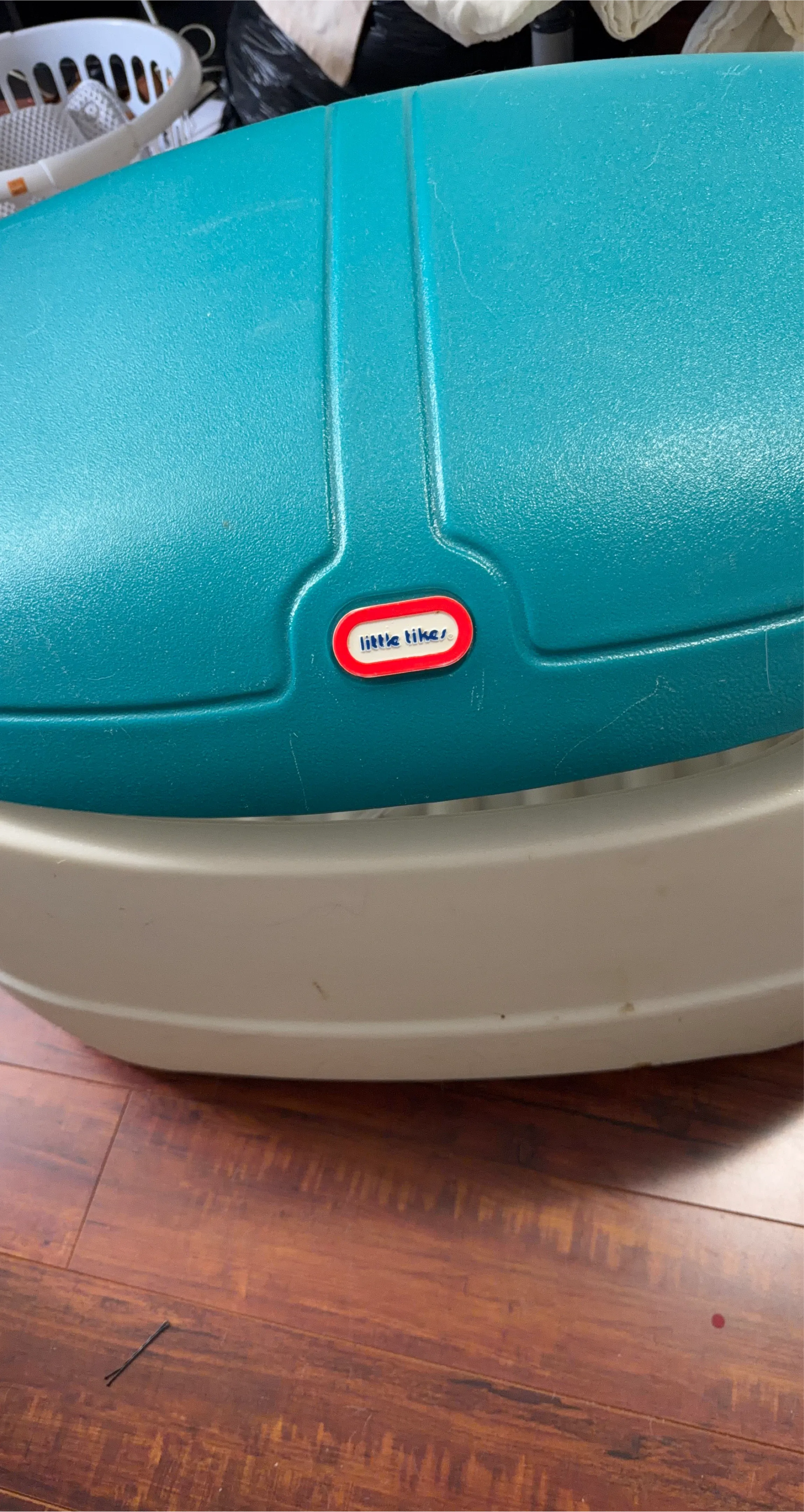 Selling a Little Tikes toy chest in teal and beige. It has some signs of use, but it's still in good condition for storing toys or other items!